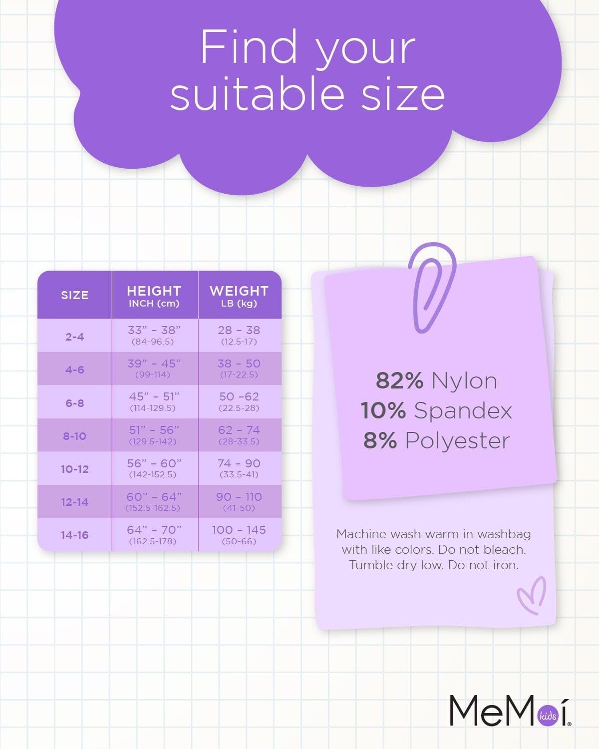 • Girl tights care. Machine wash warm in washbag with like colors. Do not bleach. Tumble dry low. Do not iron