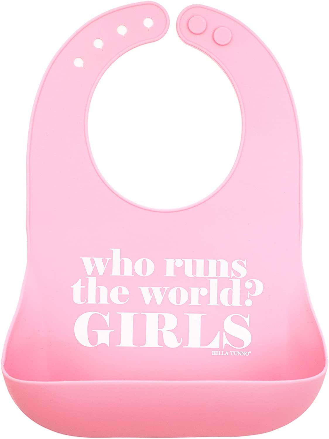 - MESS-FREE MEALTIMES: Add some humor to the highchair with this adorable “Who Runs The World? Girls” silicone bib that make everyone at the table smile—because parenting could always use more laughs; ideal for baby girl and baby boy gifts
