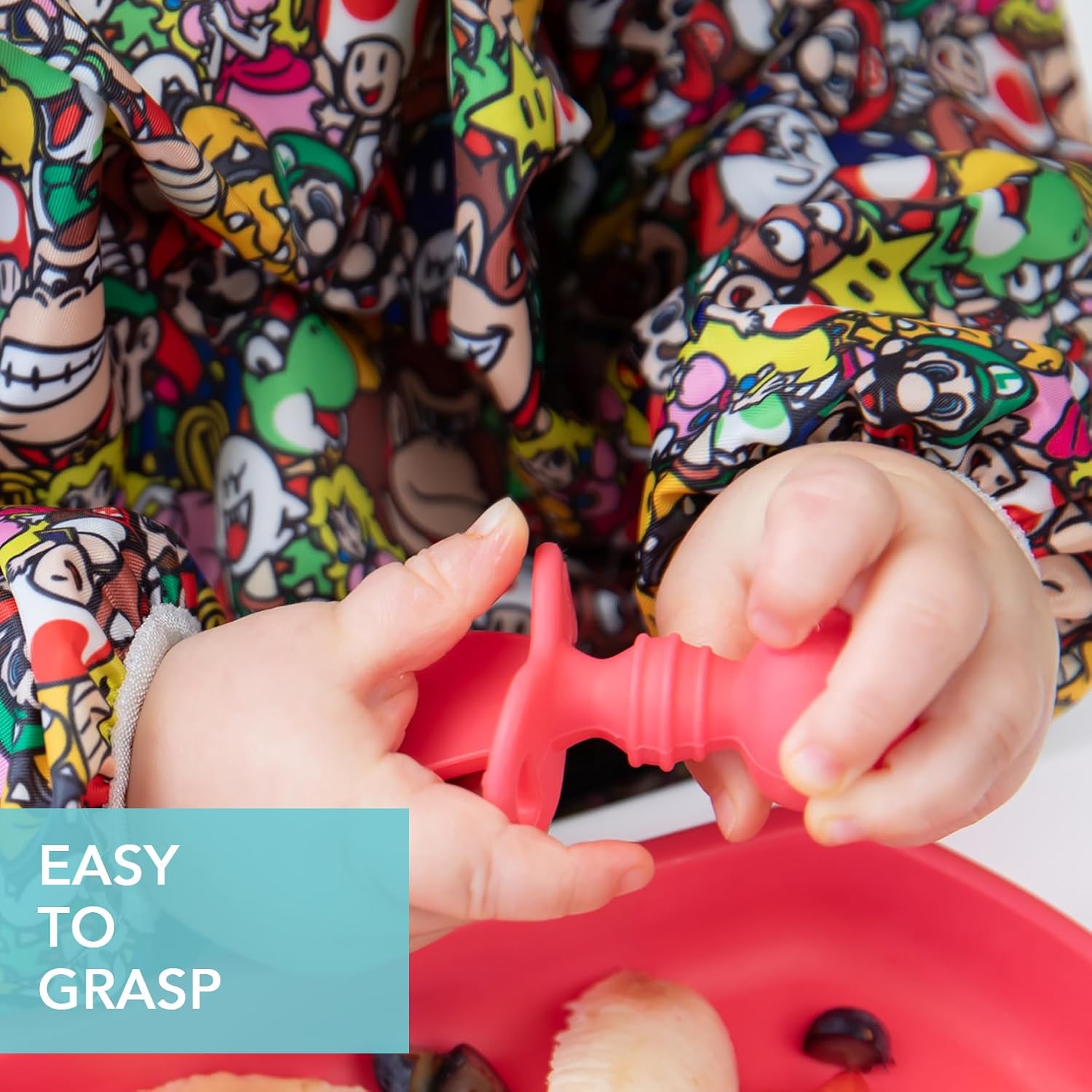 Bumkins Baby Utensils Set, Chewtensils Silicone Spoons for Dipping, Self-Feeding, Baby Led Weaning, Trainer Learning, First Stage Eating, Soft Practice Fork and Spoon, Babies 6 Months, Red