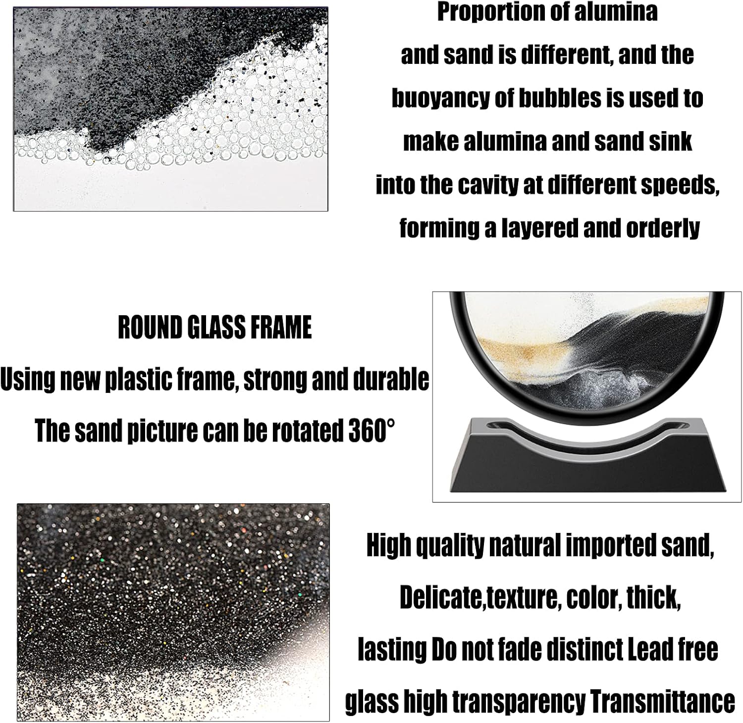 - ROUND GLASS FRAME: sand picture can be rotated 360°,Using new plastic frame, strong and durable, fresh and simple, beautiful and generous. When the glass cavity is upside down, the proportion of alumina and sand is different, and the buoyancy of bubbles is used to make alumina and sand sink into the cavity at different speeds, forming a layered and orderly