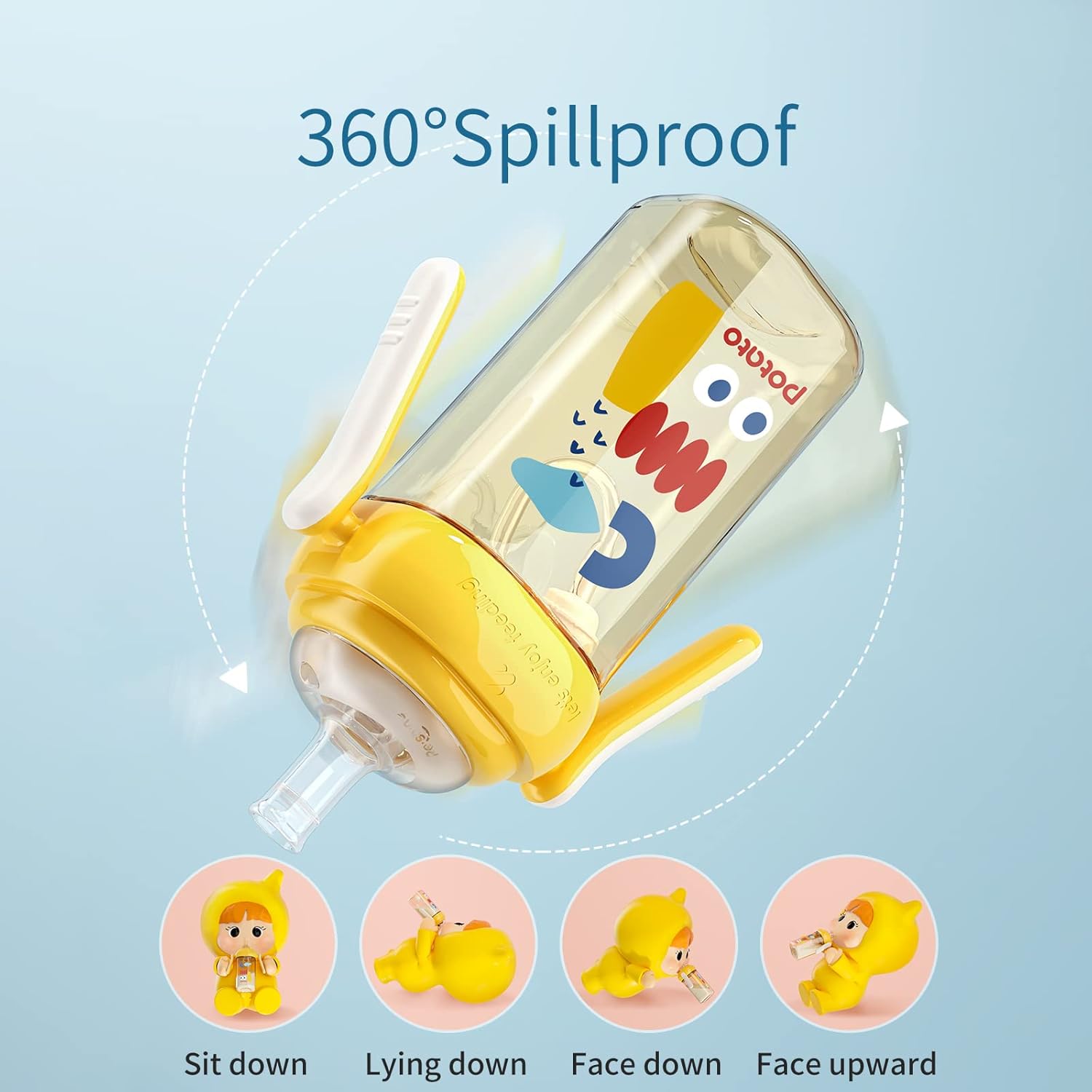 - Innovative Nozzle: The suction nozzle is a straight opening, even if the cup is upside down, it will not leak. The suction nozzle is of suitable height and fits the mouth, making it more comfortable for the baby to suck milk. The design of two air pressure holes can keep the air pressure balance between the inside and outside of the water cup, avoiding baby being flatulence.