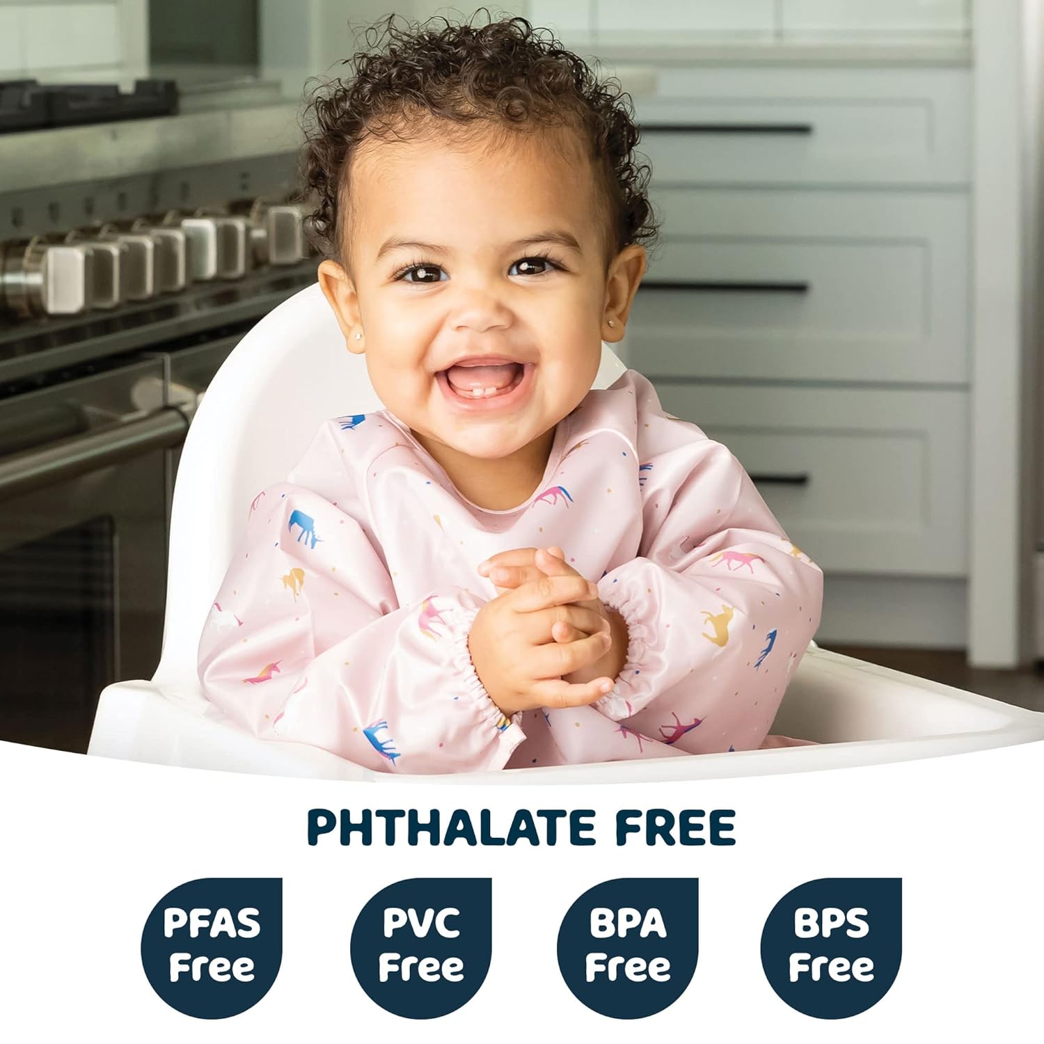 - TRAVEL BUDDY:The must-have baby feeding essentials for on-the-go parents! Our long sleeve waterproof smock bib (fits 6-24 months) is a versatile wipeable bibs with scratch-free closures and 360 degrees puree-proof protection.This bib with sleeves is perfect for plane or car meals, It folds flat in diaper bags,handles baby-led weaning messes and makes a great gender-neutral baby shower gift.Ideal for parents needing baby eating essentials on the go.