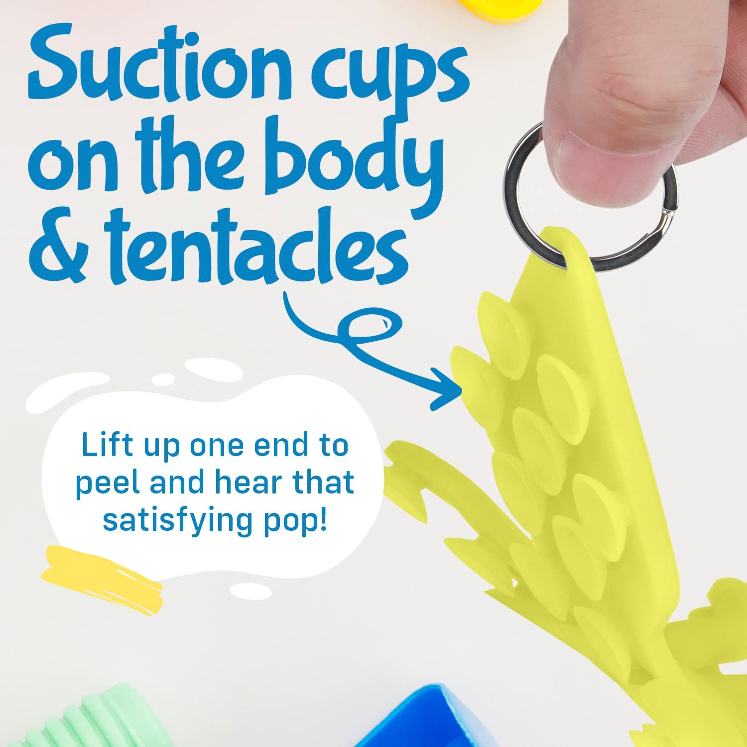 - Fidgets On-the-Go — Take your fidgets with you. This sensory pack includes 3 keychains, so you can carry your suction cup toy along. Add a squid to your child's book bag, so they can ease their stress discreetly in school
