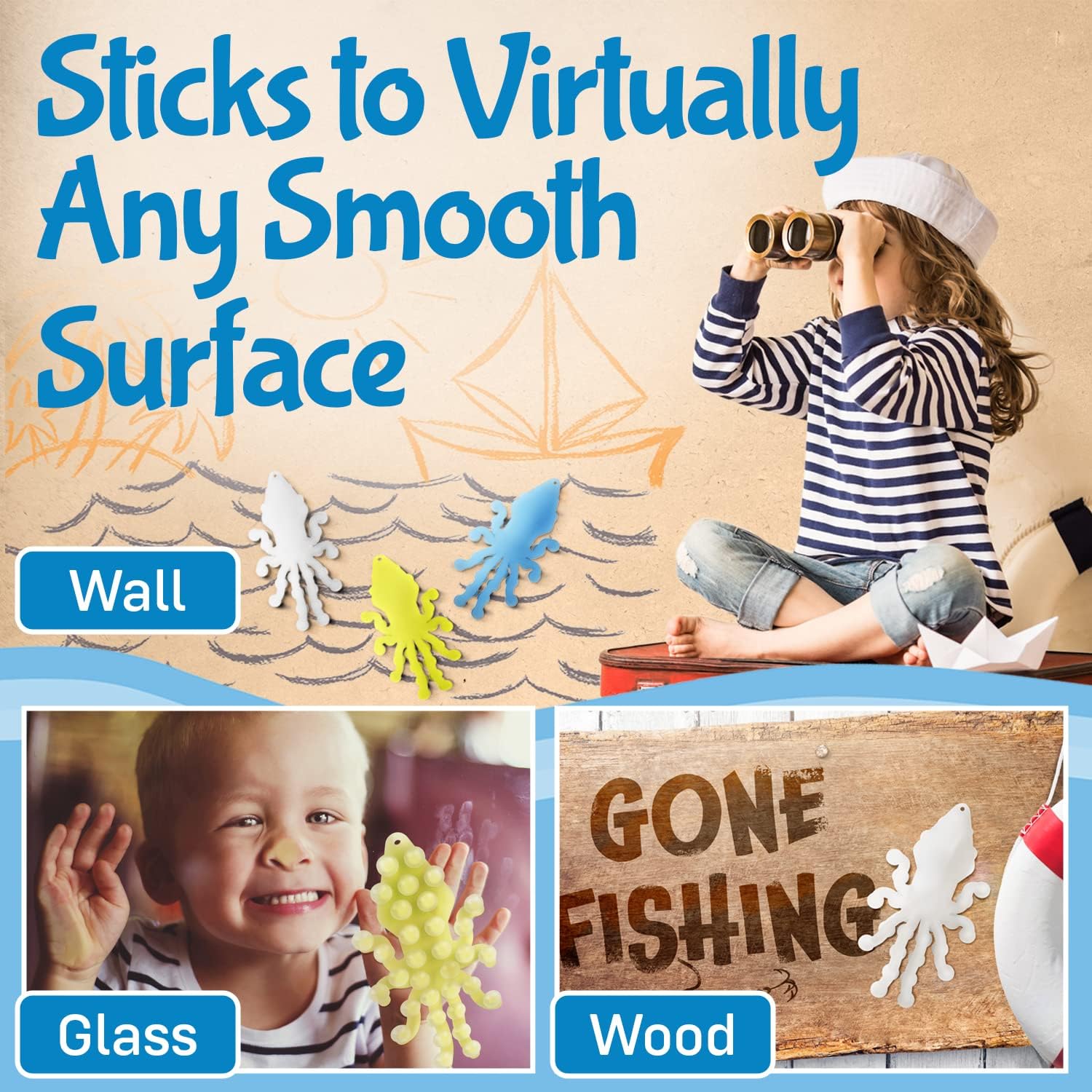 - Sticky Without Glue — Just like the real thing! These squid-shaped tactile sensory toys have suction cups on the tentacles. Stick your suction fidget toy to almost any smooth surface. Lift up one end to peel and hear that satisfying pop