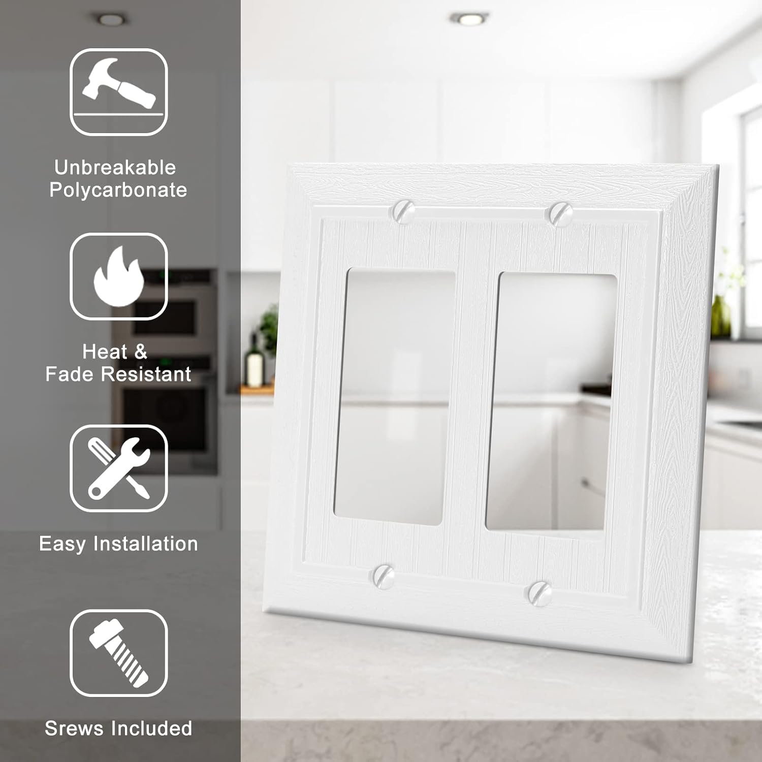 Modern Decorative Wall Plate Switch Plate Outlet Cover, Vintage Retro Wood Grain Design (Double Decorator-4 Pack, White)