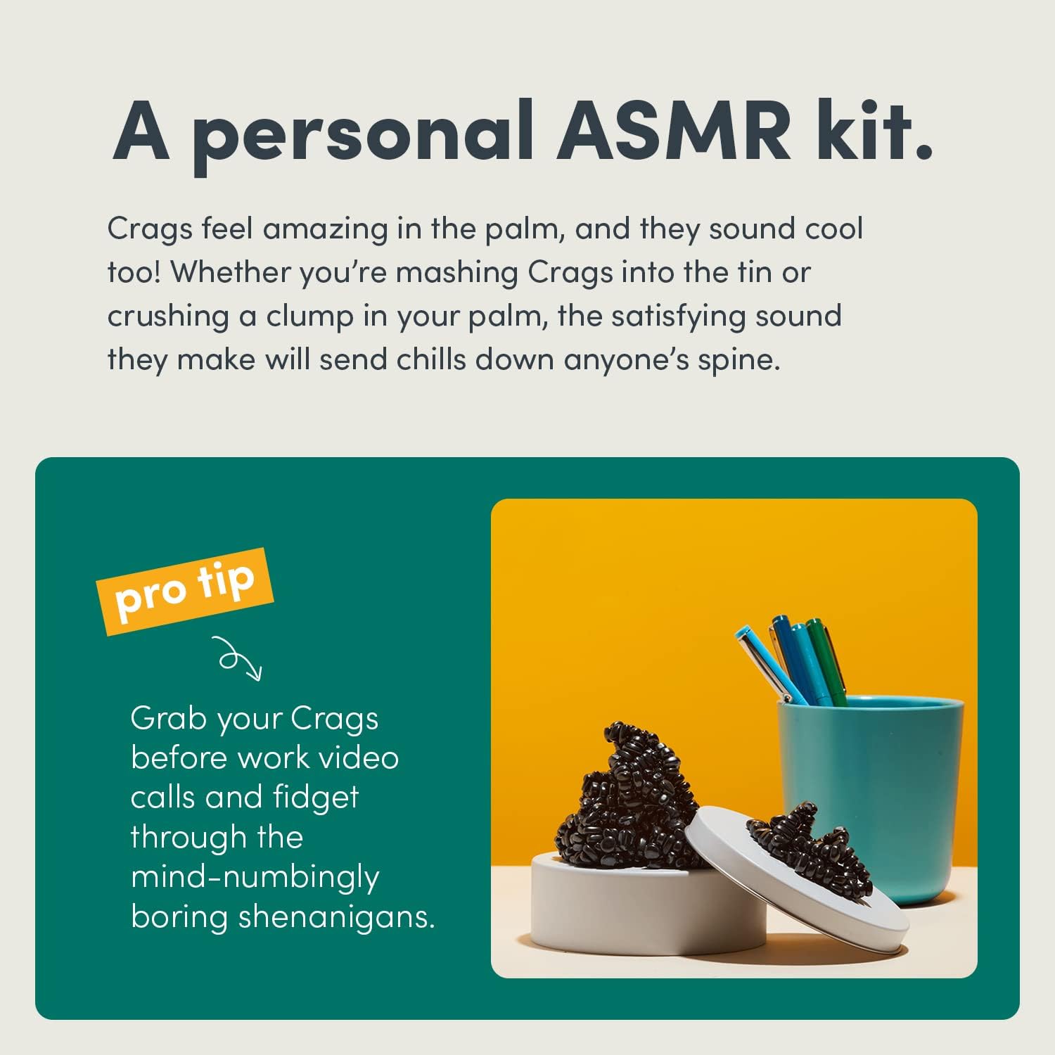 - ASMR EXPERIENCE — Satisfy your senses with tantalizing ASMR sensations anytime, anywhere, right in your palm. Looking for that elusive stress and anxiety preventing office desk toy? Crags delivers! Feel the tingle up your spine as you crush the putty in your palm, then watch the smile unfold as you drop them back into the tin. Need to focus during work calls? Crags will keep your fingers occupied, transforming dull moments into creative inspiration.
