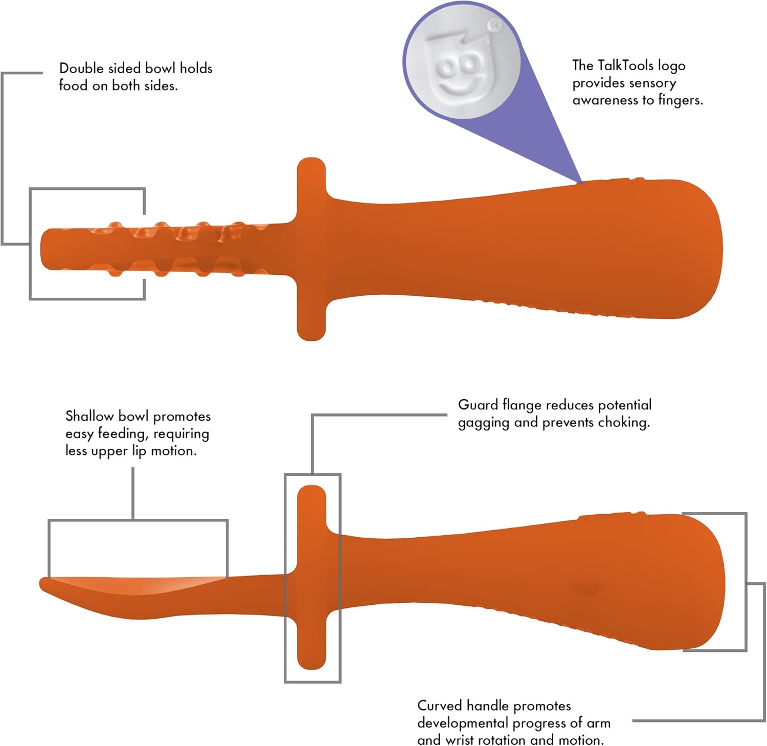 TalkTools ITSY Tiny Silicone Spoons – Twin Pack Soft Silicone Self-Feeding Training Spoons for Kids & Toddlers, Anti-Choking Flange Guard and Non-Slip Handle (Tangerine)