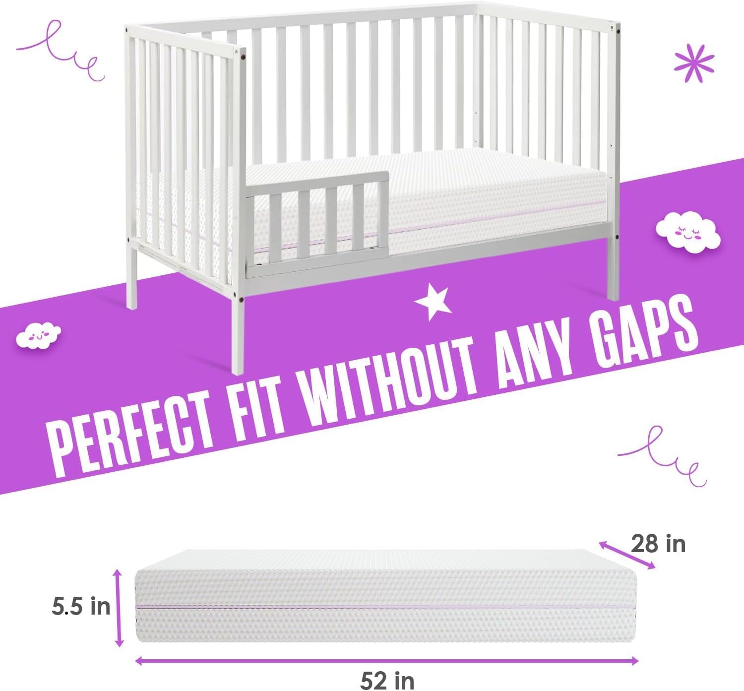 - STANDARD CRIB & TODDLER BED SIZE: Part of safety testing, we ensure that our crib mattress lays perfectly in your crib without any gaps. Measuring at 52” * 28” * 5.5” the Sleepah crib mattress will fit all standard sized cribs and toddler beds.