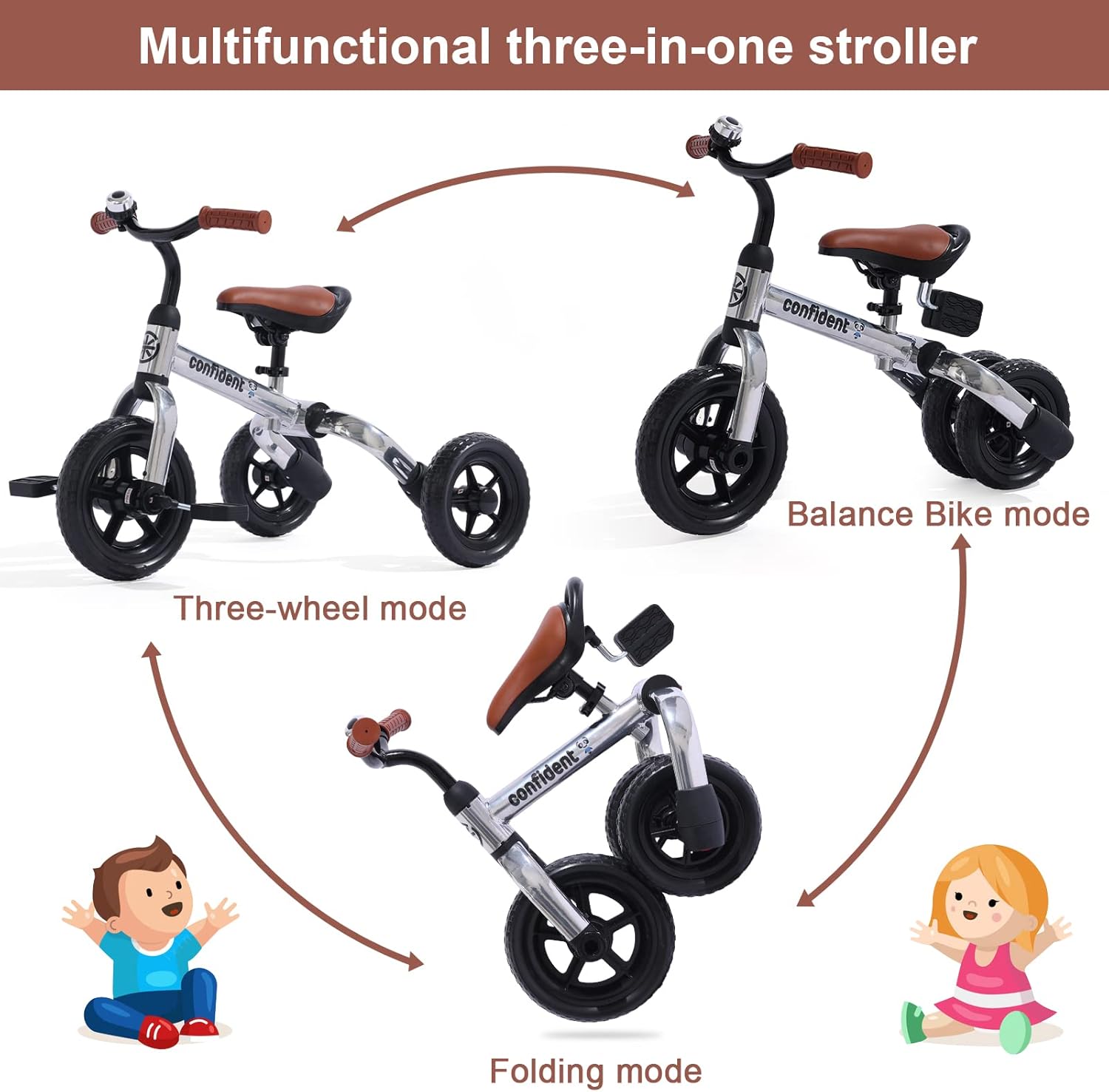 Ancaixin 3 in 1 Toddler Tricycles for 2-5 Years Old Boys Girls with Adjustable Seat Detachable Pedal and Bell, Foldable Baby Balance Bike Riding Toys, Kids Birthday Christmas New Year Gift (Silver)