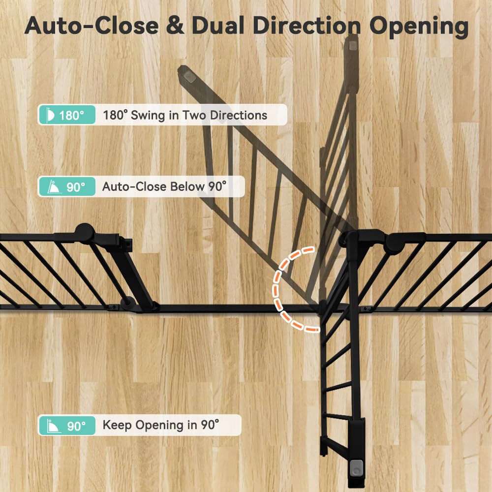 - Auto Locking & Double Safety: Our baby gate features a double-locking mechanism that locks both at the top and bottom. Simply press the button and lift it with one hand to unlock. It's easy for adults but challenging for children and pets. The dog gate automatically closes when the opening angle is less than 90°, and the door can swing in dual directions