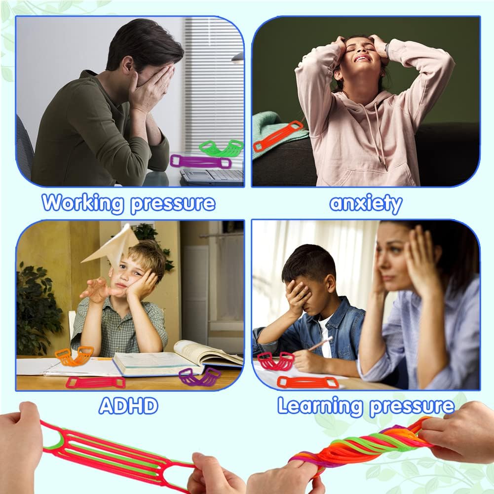 - Stress Relief Toys: These stretchy sensory toys can be calming toys for kids and adults, and also an use this elastic rope to increase our arm strength while fidgeting. While playing with them can promote fine motor skills, hand eye coordination