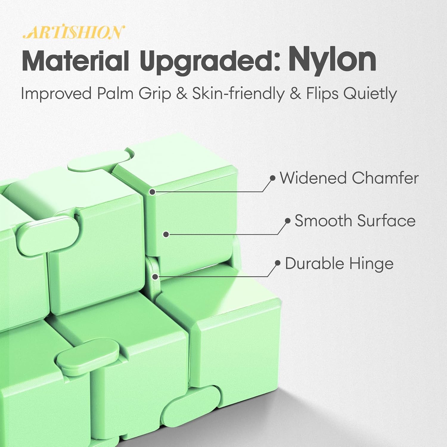 - ✔️ 𝗣𝗿𝗲𝗺𝗶𝘂𝗺 𝗡𝘆𝗹𝗼𝗻 𝗖𝗼𝗻𝘀𝘁𝗿𝘂𝗰𝘁𝗶𝗼𝗻: The ARTISHION Infinity Cube is crafted from premium nylon material, which boasts higher color fastness and wear-resistance compared to ABS material. It’s also more skin-friendly, ensuring extended durability and longevity.