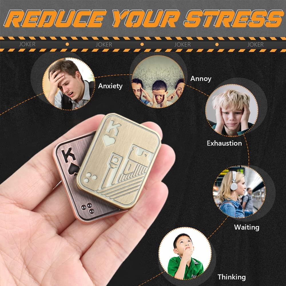 - 【Excellent Fidget Sliders】- The poker Fidgets Slider toys is entirely made of zinc alloy. The front and back of the slider are beautifully engraved with Skull and Poker King K, respectively. The color of the metal is processed by the electroplating process, so the color of the upper metal body is copper, and the color of the lower metal body is brass. Every detail of the slider has been precisely machined, and the surface treatment is delicate and smooth, making it more comfortable to hold.