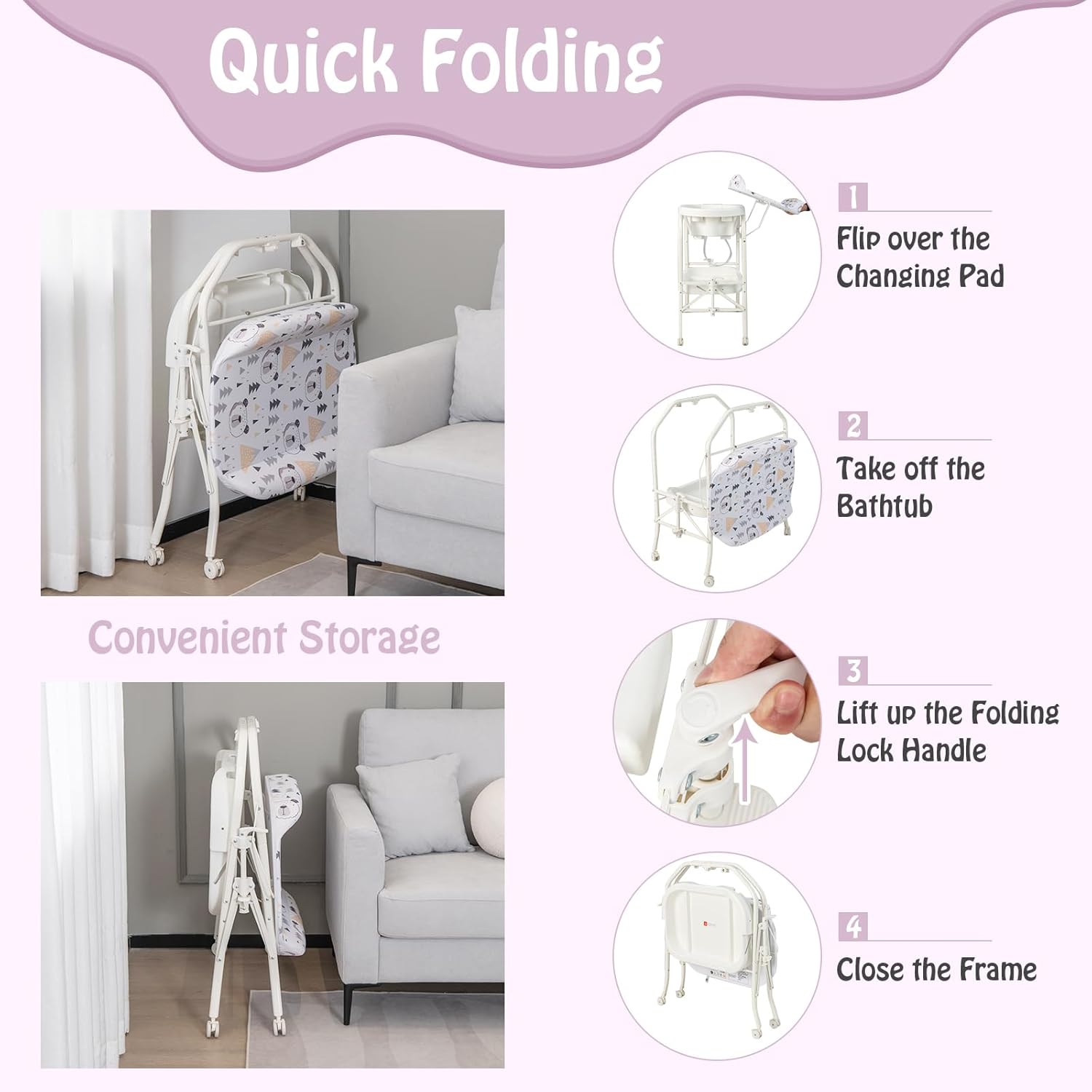 - 4-in-1 Baby Changing Table: This baby changing table with bathtub features a 4-in-1 design for versatility. You can use it to change diapers or clothes for your baby, let your baby take a shower, massage and nurse your baby, as well as hold baby essentials. And the height is appropriate so that you do not need to bend too much.