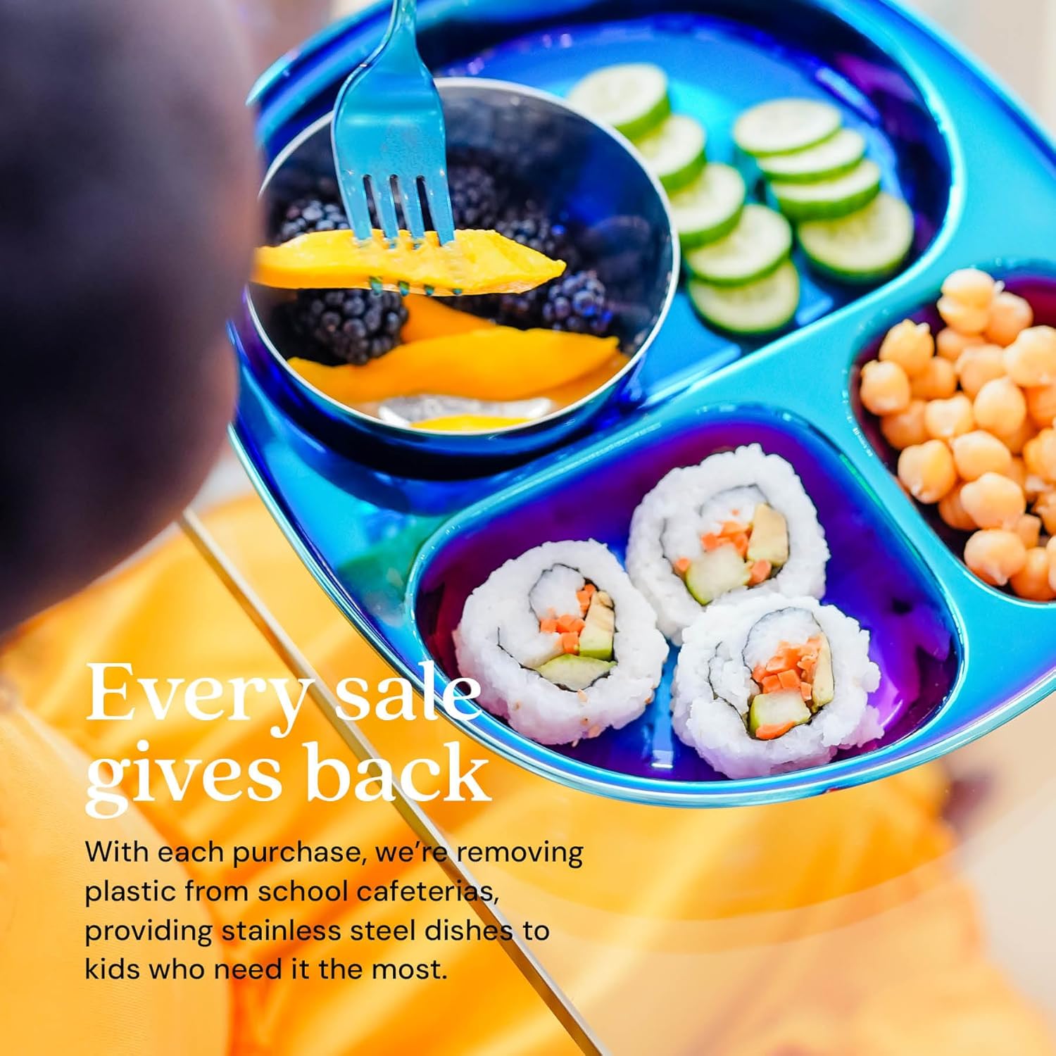 - Kid Approved β Ahimsa Mindful Mealtime Sets make mealtime fun with vibrant and colorful stainless steel kids plates that children adore. Included is a stainless steel toddler plate with dividers, a 8 oz. kids stainless steel cup and small baby bowl, and kids silverware (1 kid fork, 1 kid spoon).