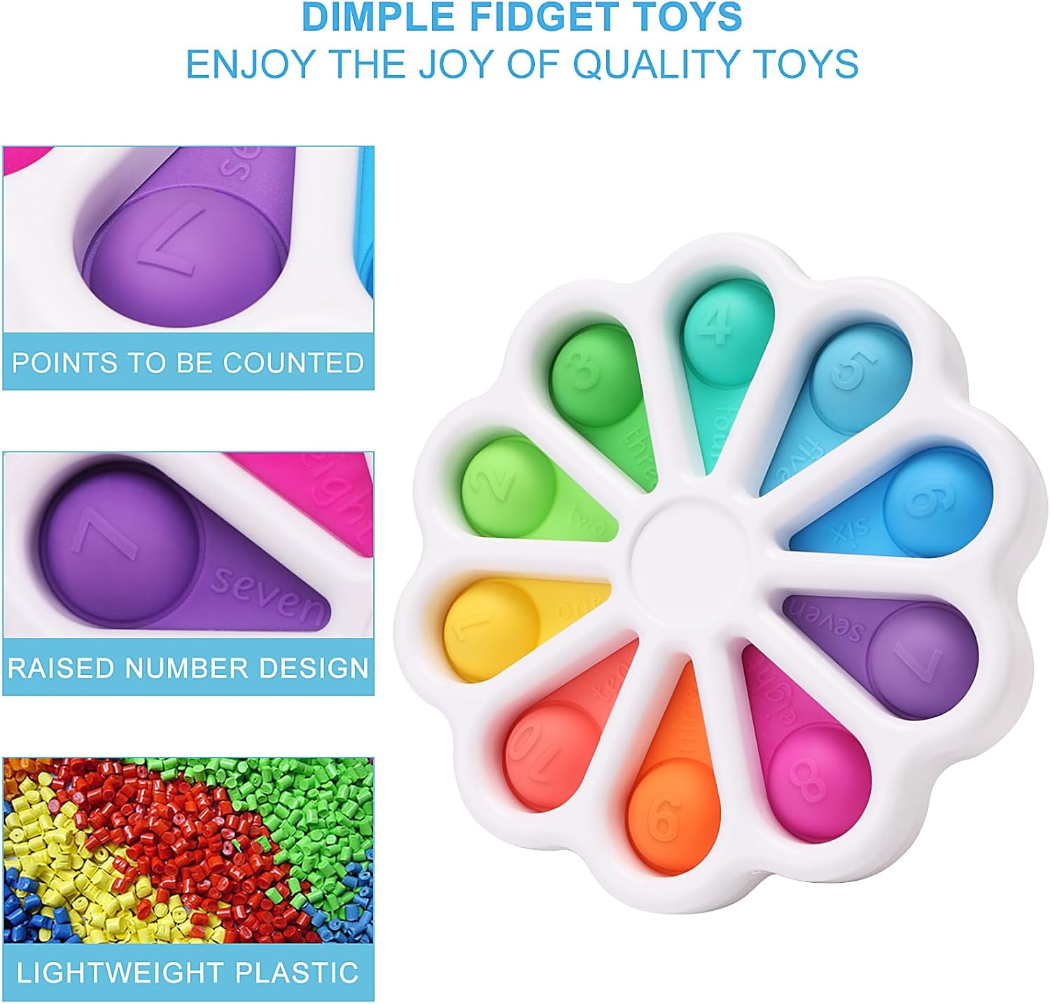 - STRESS RELIEF: Have you noticed that your child, or yourself, suddenly feeling anxious, restless, and a bit OCD? Dimple Toy with 10 Colour Fidget Toy It helps to relieve anxiety and create a good atmosphere, when press the bubbles, The toddle pop push it toy will make a slight popping sound, When all the bubbles on the front are squeezed, Then flip it over and start again, Give you endlessly fun.