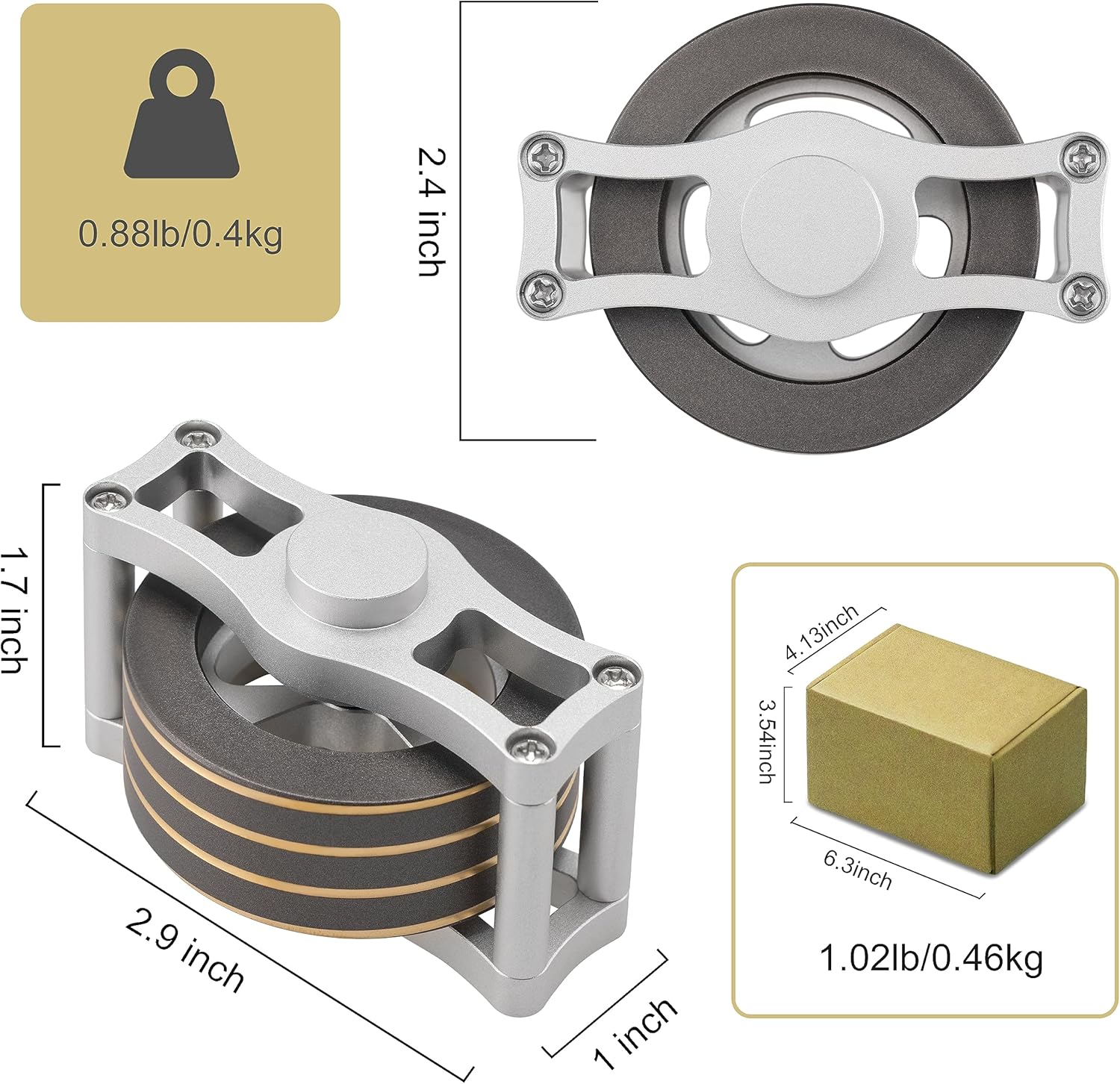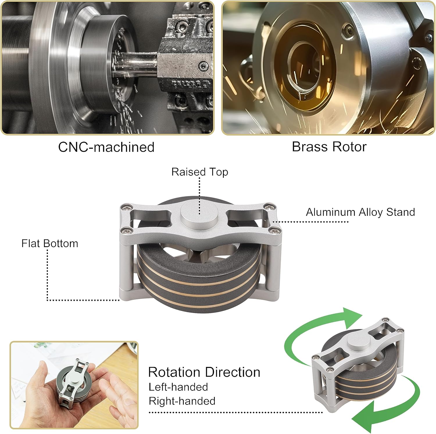 - 【EXQUISITE BRASS KINETIC SPINNER】Crafted through CNC machining with a copper rotor and aluminum stand. This mesmerizing fidget spinner boasts an engraved spiral pattern, creating a 360° optical illusion effect when spinning.