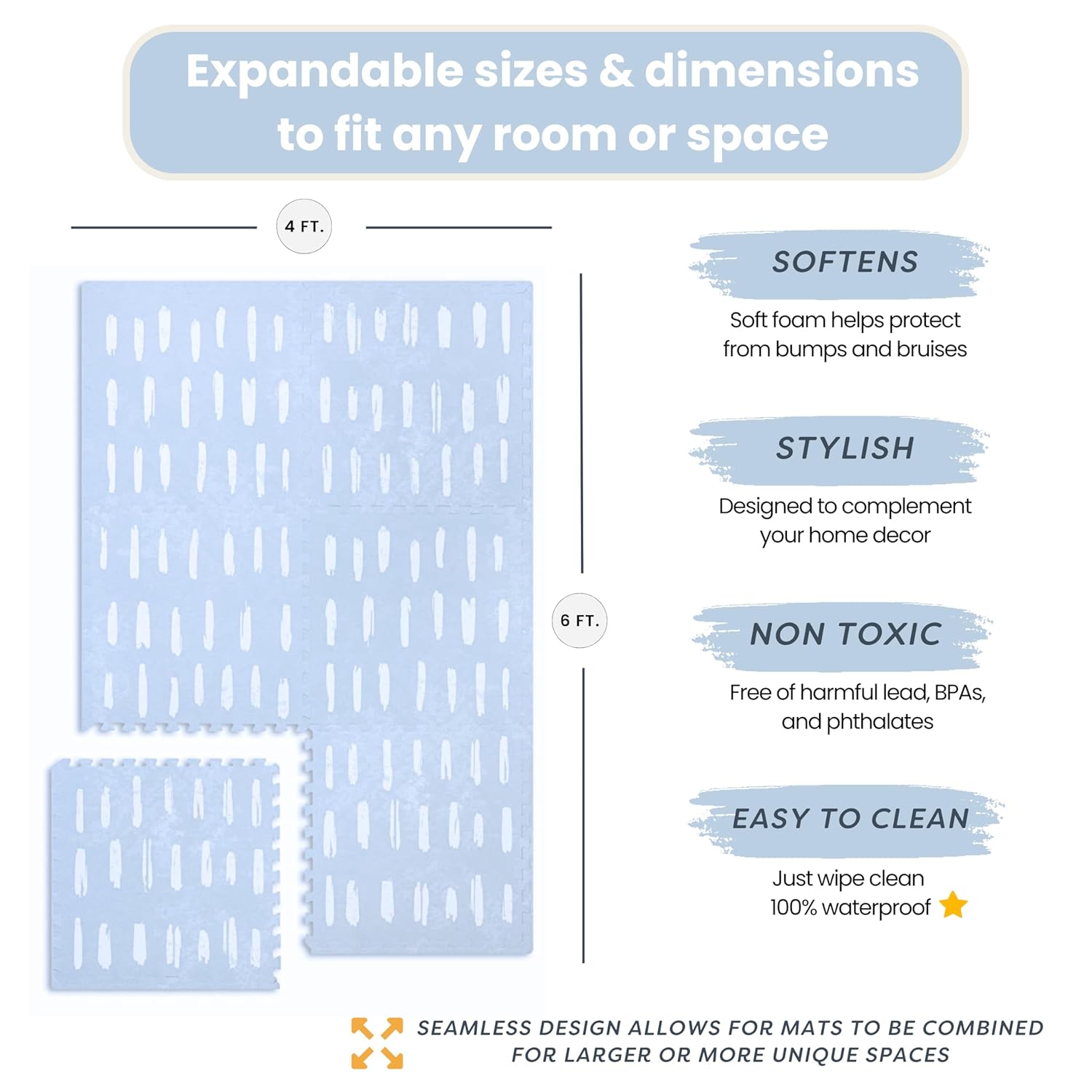 - ā MAKES ANY ROOM A SAFE SPACE - Our play mat is not just a regular mat, it's an entire play area for your child. It's perfect for playrooms, living rooms, and even outdoor use. They protect from bumps and bruises and are great for hardwood floors, marble floors, or low pile carpet. The mats can be easily stored or quickly put together so there's always plenty of room for your little one to roll, crawl, and explore.