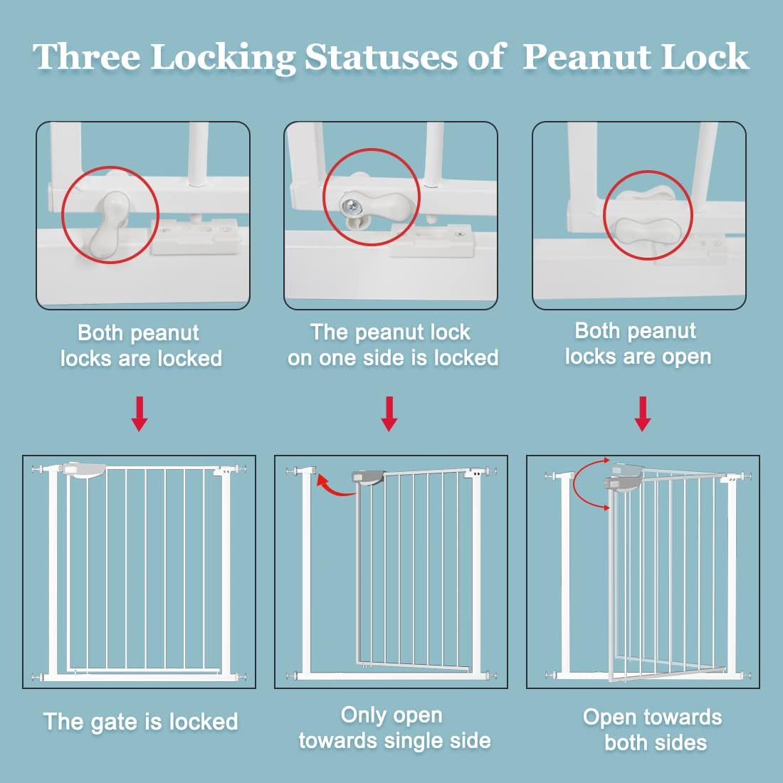 - 【Multiple modes】 Our triple lock gate has various statuses to meet your multiple needs in life. When all three locks are locked, little babies or pets will be stopped by it. At the bottom , there are two peanut locks to control the opening direction and locking. If the peanut lock on one side is locked, the gate can only be opened towards single side. If both peanut locks are open, the gate can swing both ways. Besides, it will stay open at 90 degrees and auto-close when it's less than that.