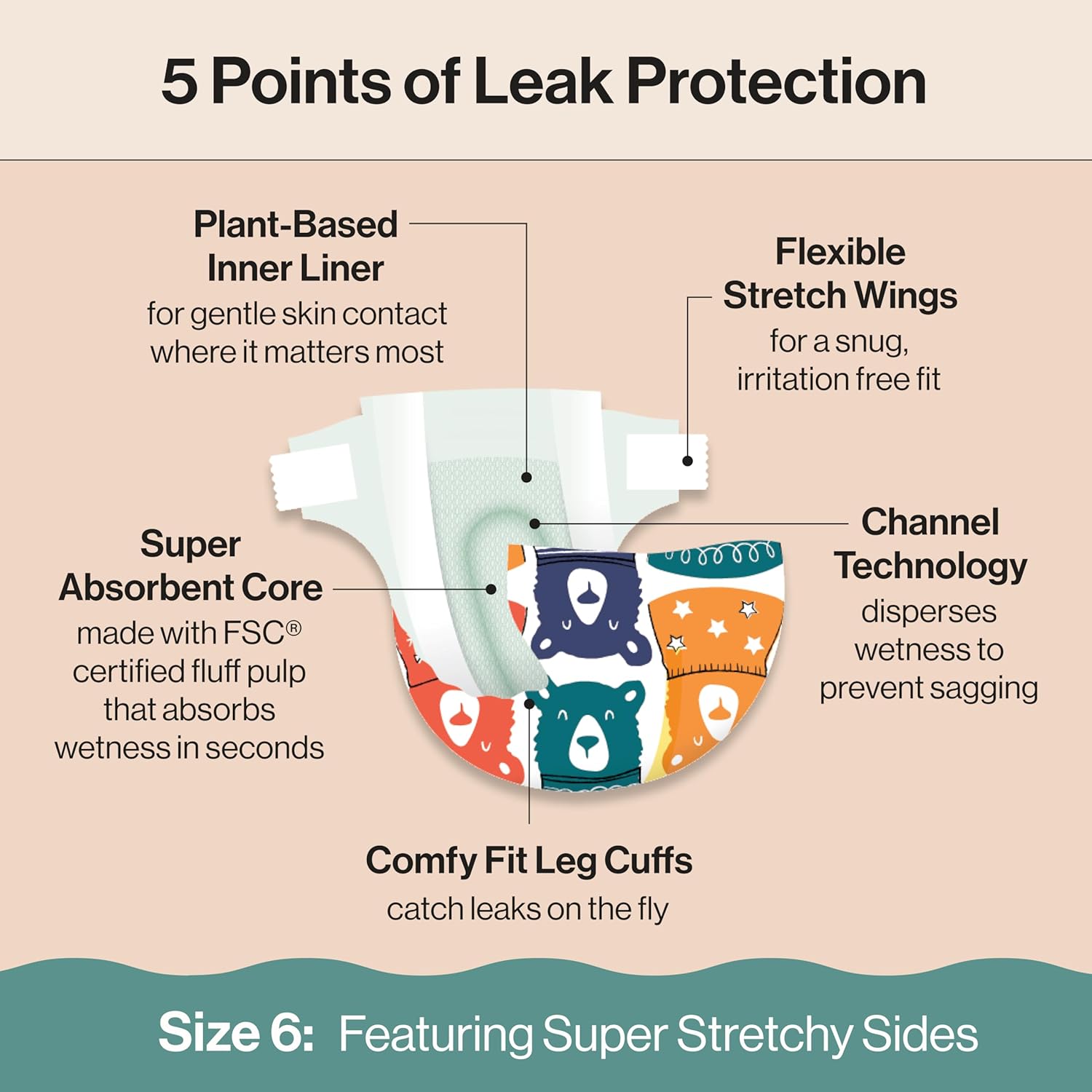 The Honest Company Clean Conscious Diapers for Delicate Skin | Up to 100% Leakproof | Hypoallergenic, Fragrance Free | Gender Neutral | Club Box, Size 6 (35+ lbs), 40 Count (Prints May Vary)