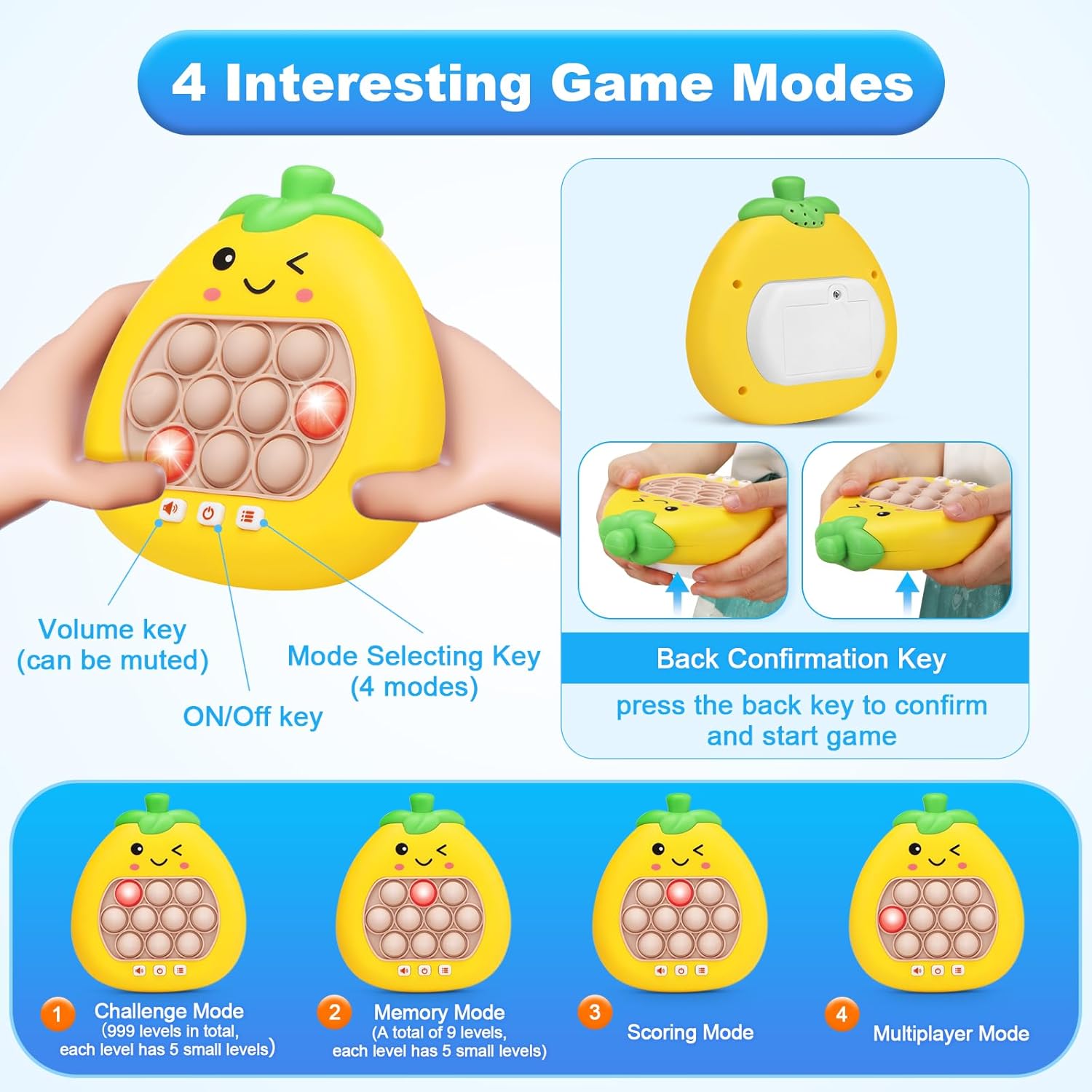 - 【4 MODES POP GAME FIDGET TOY】: Upgrade Pears pop fidget console game pro toys,Breakout Mode, Memory Mode, Score Mode and Multiplayer Mode. There are 999 levels in the challenge mode, each mode has different difficulty, and the multiplayer mode can support parent-child interaction. You can also play with friends to cultivate children's sense of competition and teamwork.
