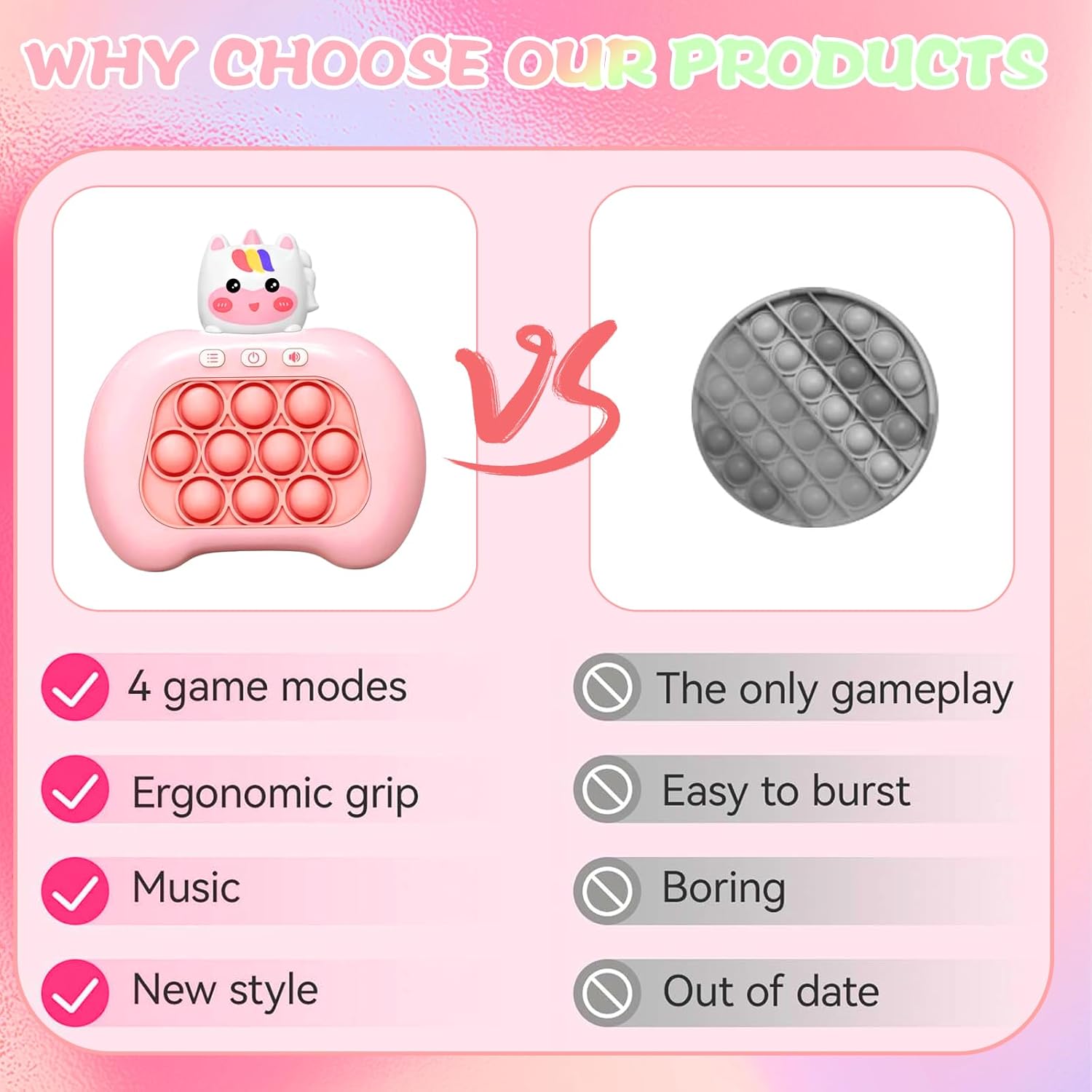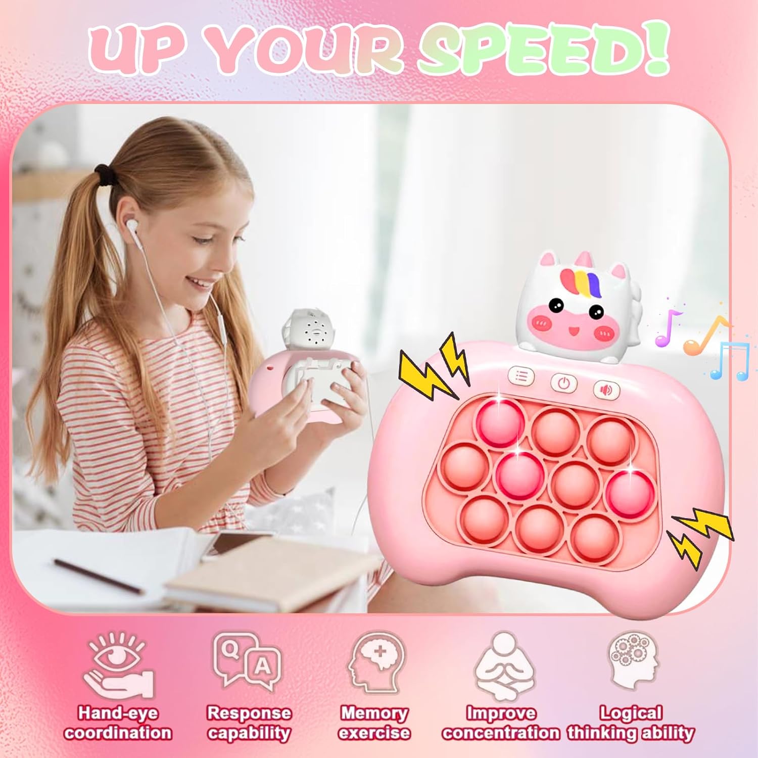 - 【Quick Push Pop Game 】 With their unique burst bubble mechanism and dynamic music Press the push pop to fidget sensory toy can reduce stress, fatigue or anxiety, bring you peace of mind, Kids will engage in positive thinking, hand-eye coordination, and brain training during play challenges filled with lights and sounds, promoting your child's sensory development.