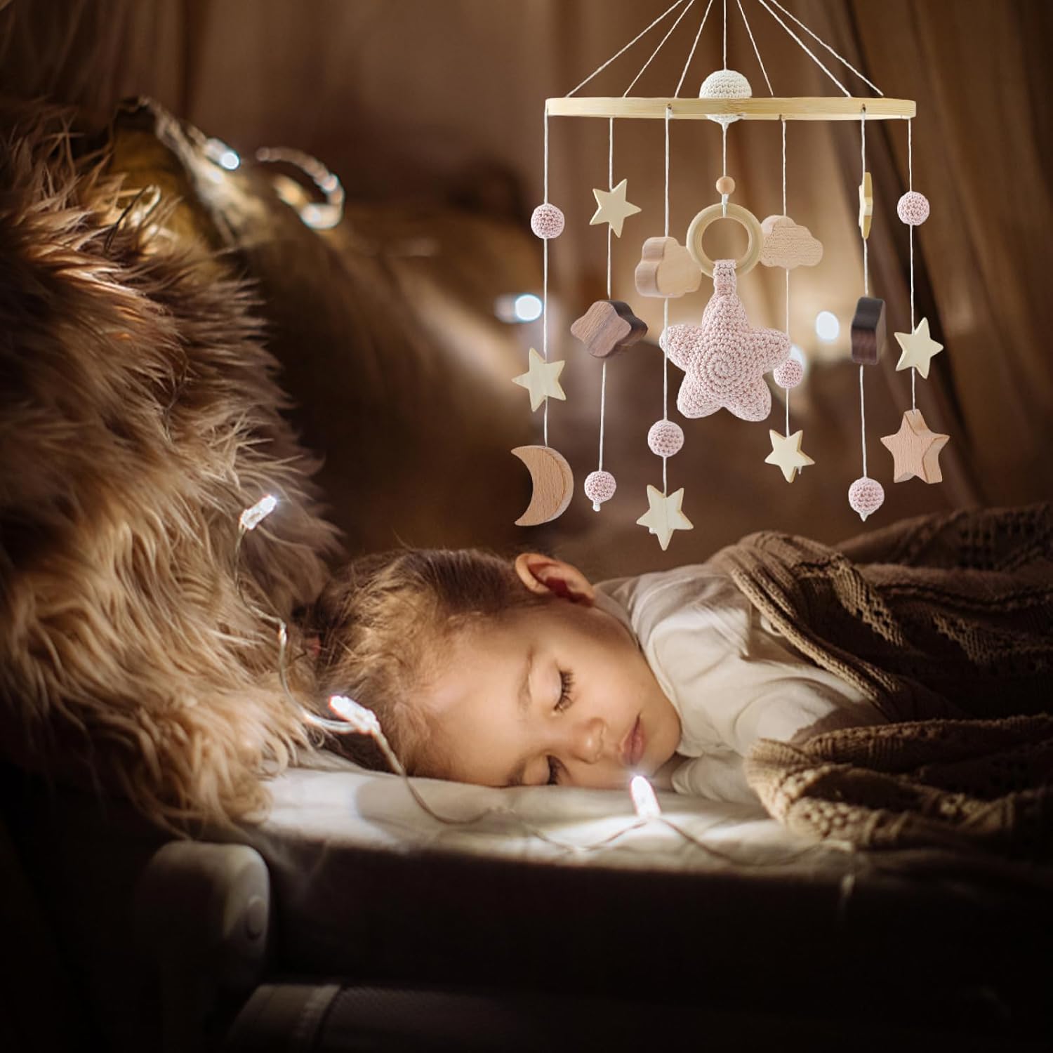 - ✨ PROMOTES HEARING AND VISUAL DEVELOPMENT - Simply Hang the nursery mobile on a baby mobile holder (not included). The natural soothing color provides enough interest & imagination for infants newborns but does not overstimulate. Our baby crib mobile contains bells that will make a pleasant sound when it trembles slightly or when the wind blows. It helps the baby calm down slowly and fall asleep slowly.