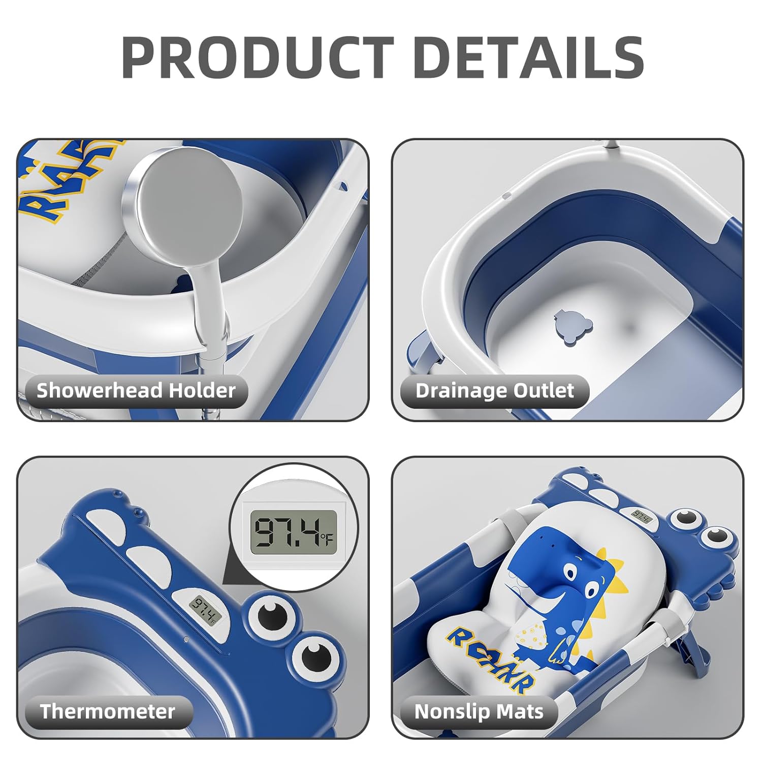 - Innovative Double-Fold Design: Our baby bathtub boasts a space-saving double-fold design, measuring under 4 inches in thickness. This allows for easy storage in tight spaces and enhances portability, perfect for both home use and travel. The off-the-floor drain with a user-friendly rubber plug ensures seamless water drainage without the need for relocation.