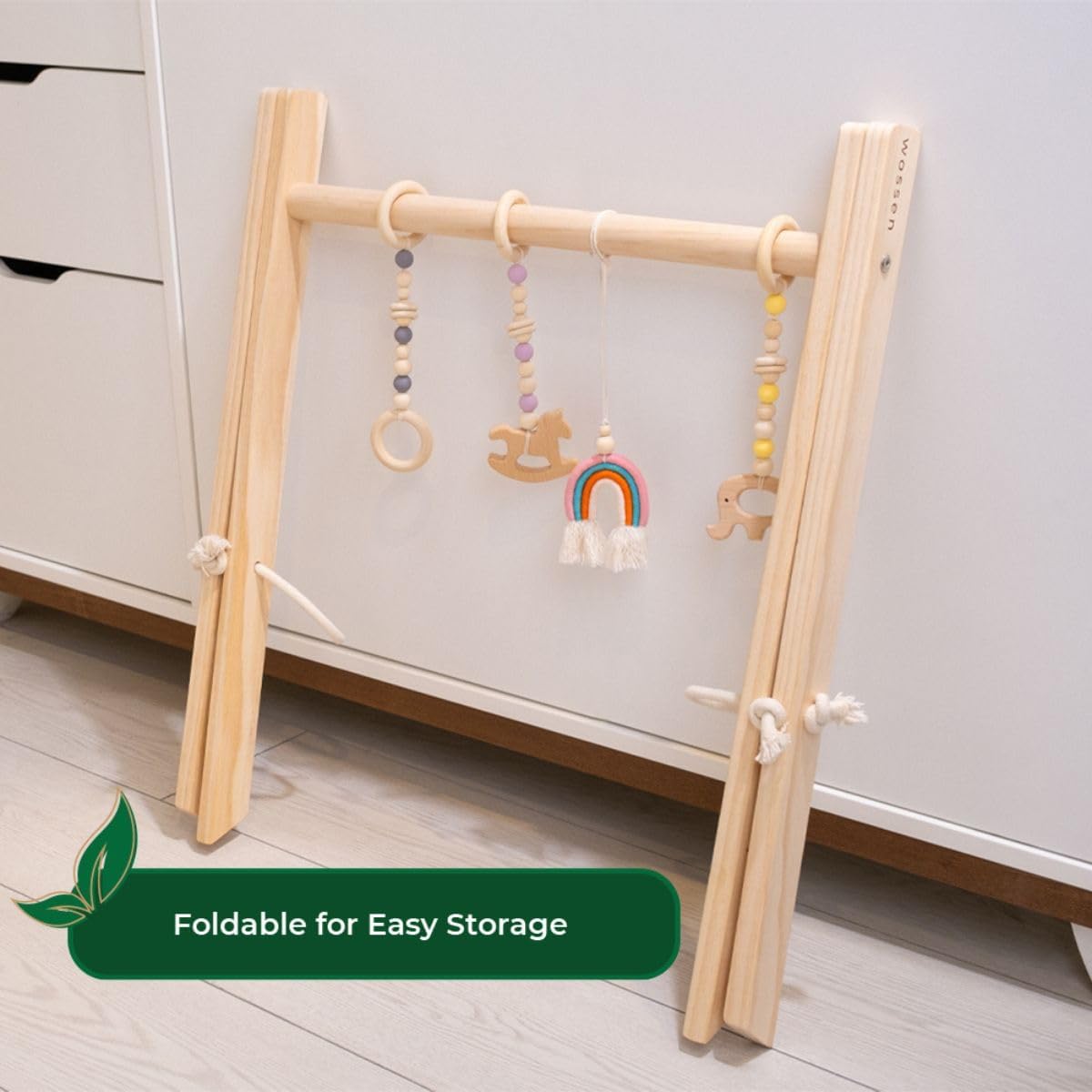 - Natural Wooden Toys: Wossen Baby PlayGym Set draws attention with its natural wooden toys. Designed with your baby's safety and health in mind, these toys are environmentally friendly while improving their tactile and visual perception.