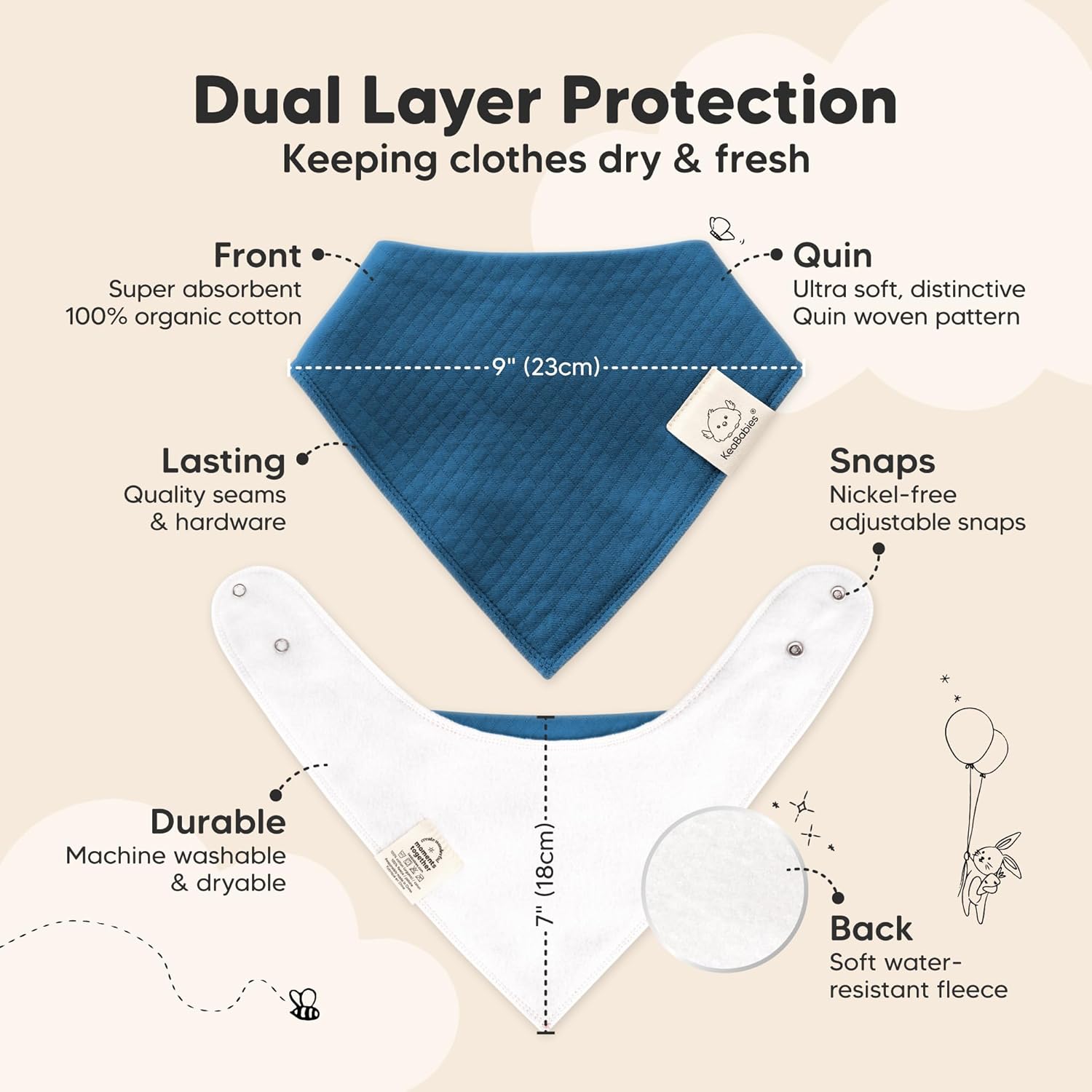 - Super Absorbent - Our organic baby drooling bibs are made with 100% organic cotton (GOTS-certified) Quin fabric and backed with water resistant fleece for added absorption. This dual layer design helps to keep your baby clean and fresh all day long.