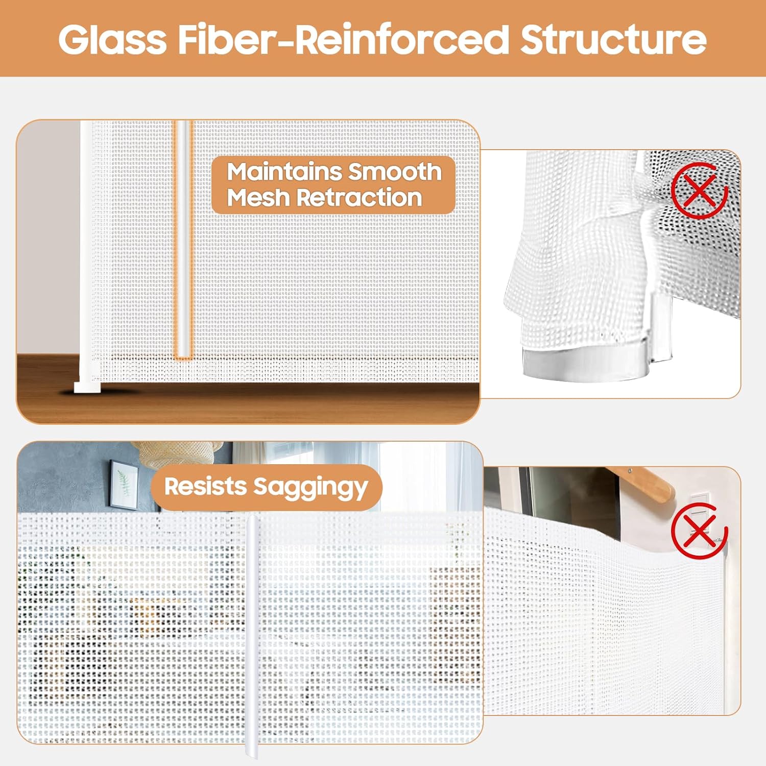 - 【Fiberglass Support】We have upgraded the retractable gate with fiberglass support strips, which prevent kids and pets from going under the mesh and reduce wrinkling. The mesh expands smoothly without getting stuck, making it effortless to use.