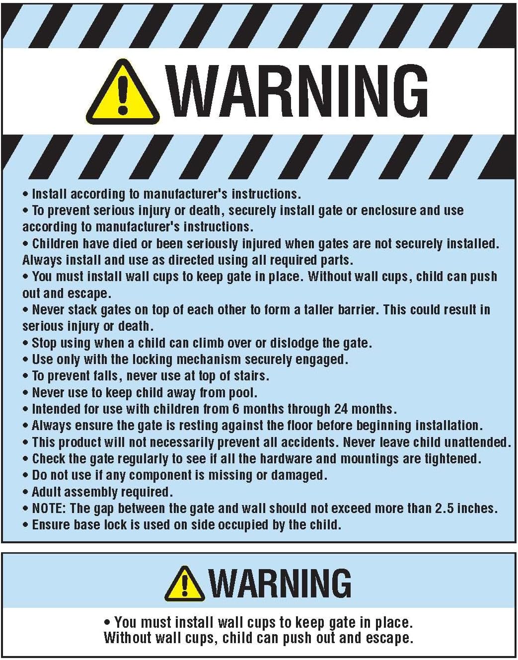 - SET UP: Install according to manufacturer’s instructions. You must use wall cups to keep gate in place. To prevent falls, never use at top of stairs.