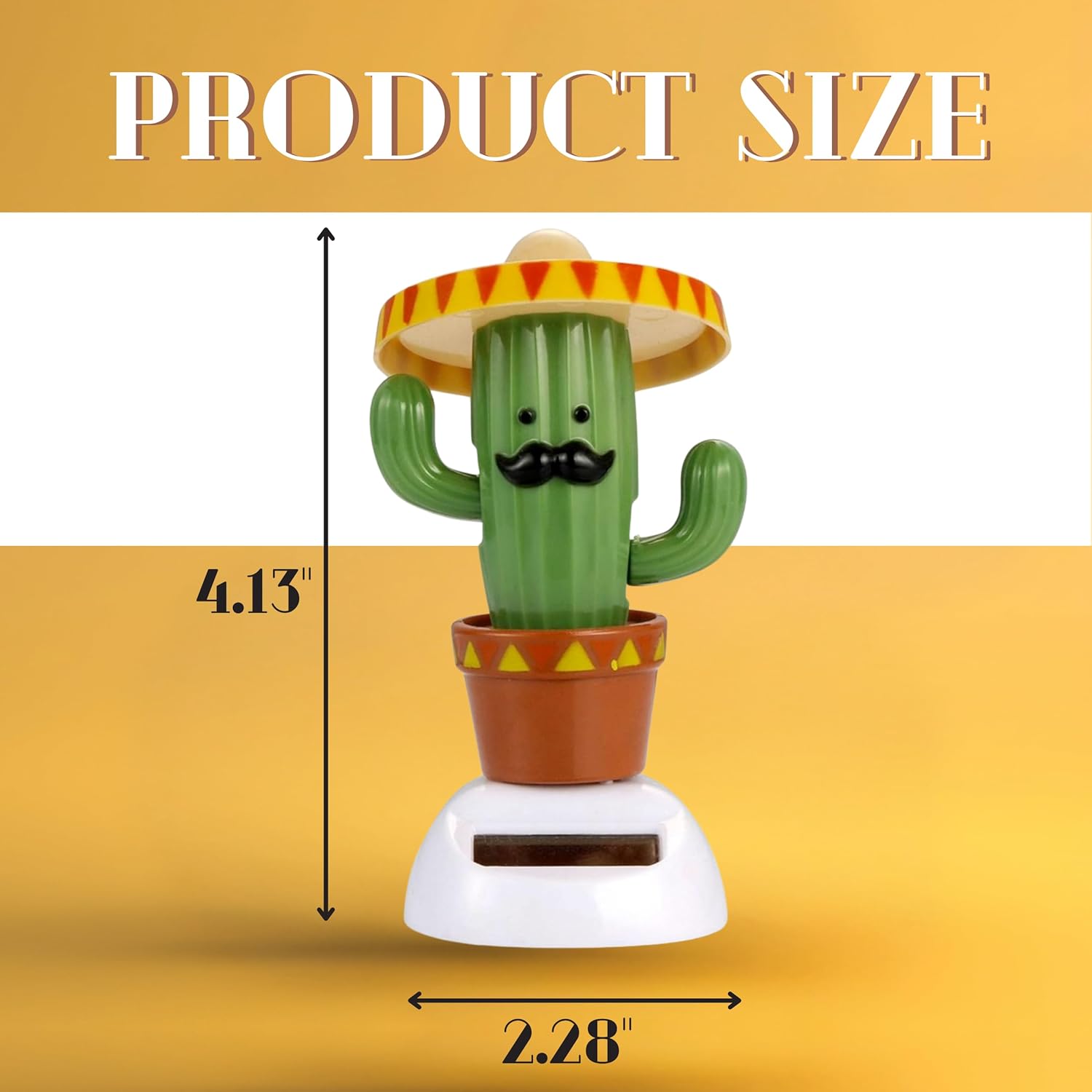 - This car dash solar toy is 4.13 inch high and 2.28 inch wide, these dimensions are convenient so you can place this solar panel dancing toy anywhere you want. Solar dancing car toy is created in the shape of a cactus in a pot with a funny hat. Thanks to the solar panel, the solar plant dancing toy works and the cactus begins to dance, moving its arms
