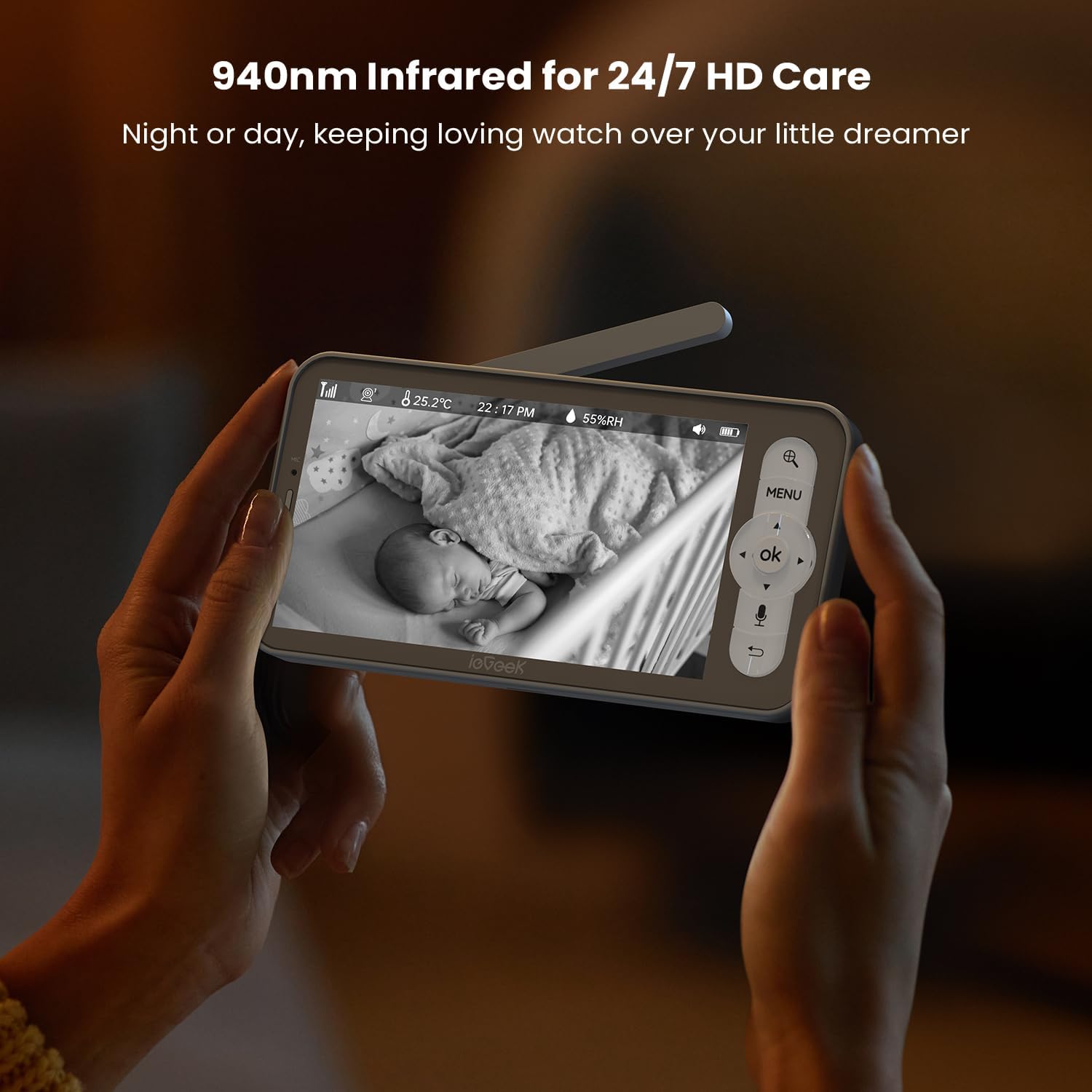 - 𝗨𝗹𝘁𝗿𝗮-𝗖𝗹𝗲𝗮𝗿 𝗕𝗮𝗯𝘆 𝗠𝗼𝗻𝗶𝘁𝗼𝗿𝗶𝗻𝗴 - 𝟮𝗞 𝗩𝗶𝗱𝗲𝗼 𝘄𝗶𝘁𝗵 𝟱" 𝗦𝗰𝗿𝗲𝗲𝗻: The 2K video baby monitor with a large 5" screen vividly captures every yawn and giggle, while the advanced night vision ensures your baby’s room is as clear as day, even in complete darkness. Capture every moment in stunning HD with this monitor, ensuring you peace of mind when you need to step away, knowing you're always there for your baby.