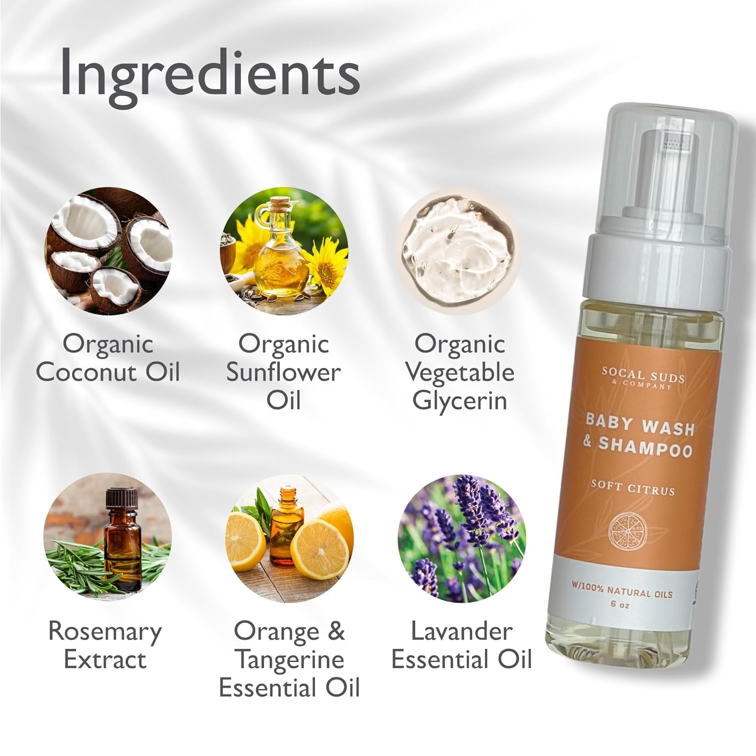 - GENTLE CARE IN EVERY BUBBLE: SoCal Suds & Company's foaming organic baby wash and shampoo features saponified oils of organic sunflower and coconut. This gentle formula is enriched with distilled water, organic vegan glycerin, and rosemary extract, offering a nurturing cleanse that honors the delicate balance of any skin type. Embodying our commitment to natural and organic care.