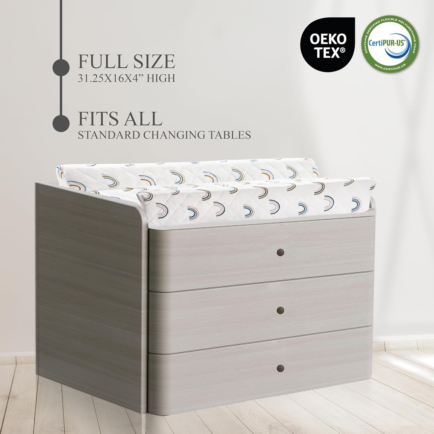 - SOFT CUSHIONED PAD FOR CHANGING TABLE | Premium Pillow Topper Provides Baby with Fluffy Support, Breathable Comfort & Dependable Safety During Diaper Changes, Swaddling, Dressing, Grooming & More | Mat Measures 31.25 x 16” & Includes Adhesive Straps for Secure Mounting on Any Standard Size Changing Table, Dresser Top, or Similar Surface