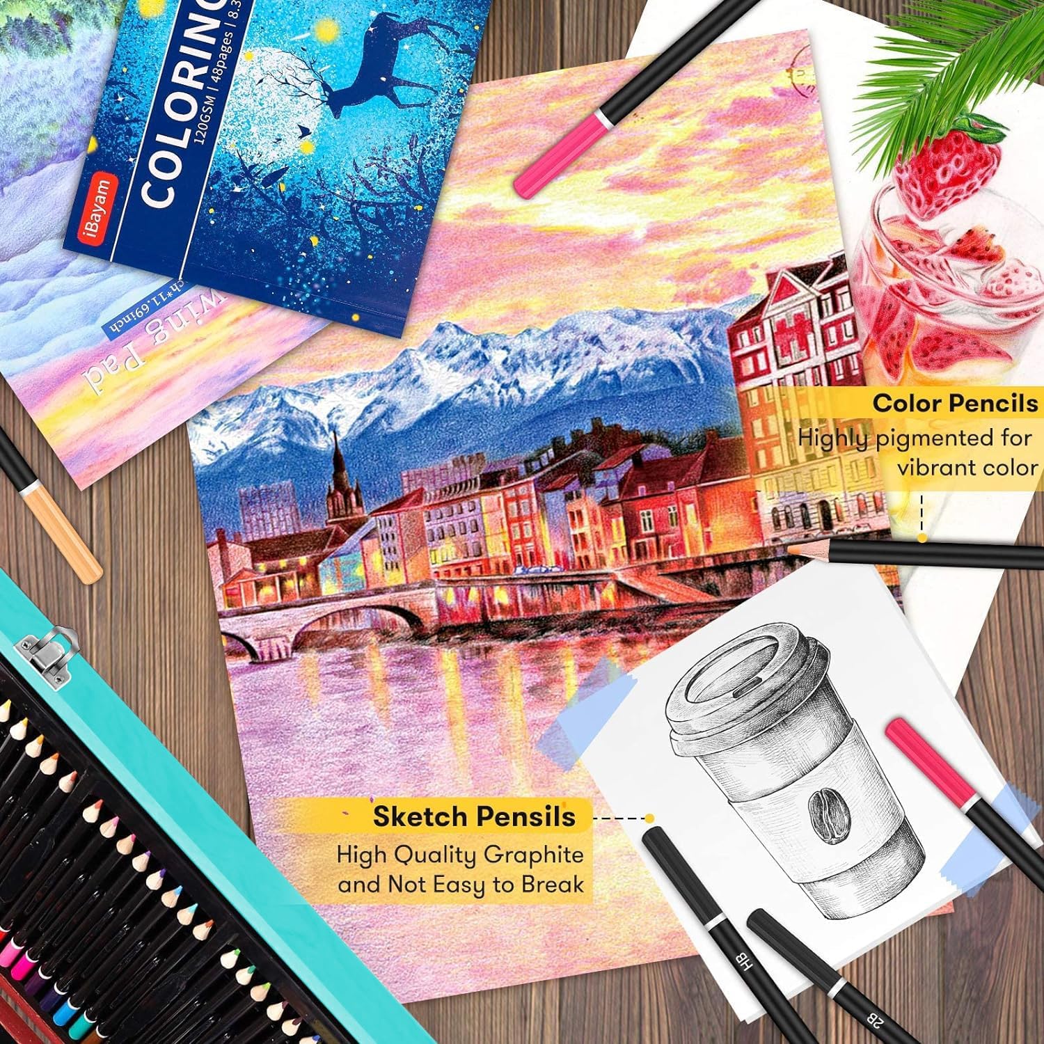 iBayam Art Supplies, 150-Pack Deluxe Wooden Art Set Crafts Drawing Painting Kit with 1 Coloring Book, 2 Sketch Pads, Creative Gift Box for Adults Artist Beginners Kids Girls Boys