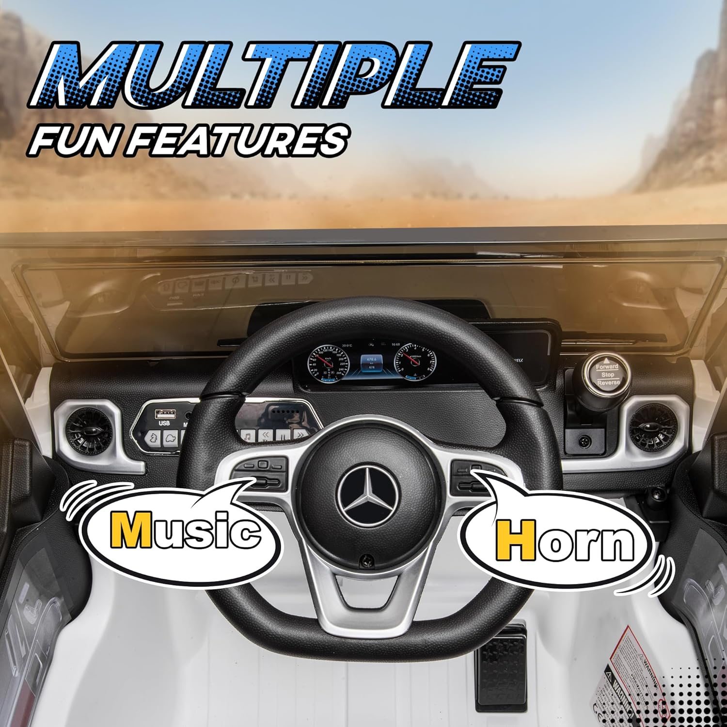 - Licensed Kids Mercedes Benz G500: This Mercedes Benz kids car has a realistic look, working lights, an illuminated dashboard, and a realistic steering wheel.