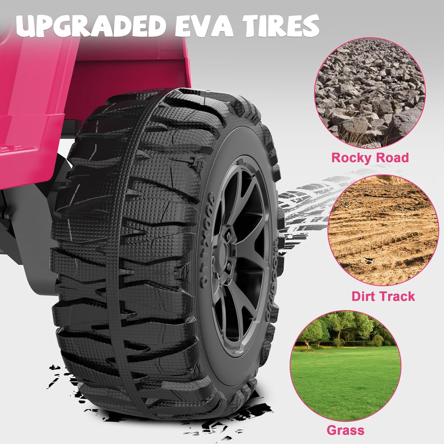 - [Conquer Any Terrain] The ride on car's 4 large-diameter EVA explosion-proof tires offer better traction, wear resistance, anti-slip properties and durability compared to ordinary plastic tires, making this off-road kids ride on toys can conquer most types of roads, such as sidewalks, grass, or gravel. Its excellent suspension system will reduce bumps and vibrations, providing a comfortable ride to the little drivers. Whether playing or exploring, this kids electric car empowers kids to confidently tackle the outdoors, turning every journey into an exciting adventure