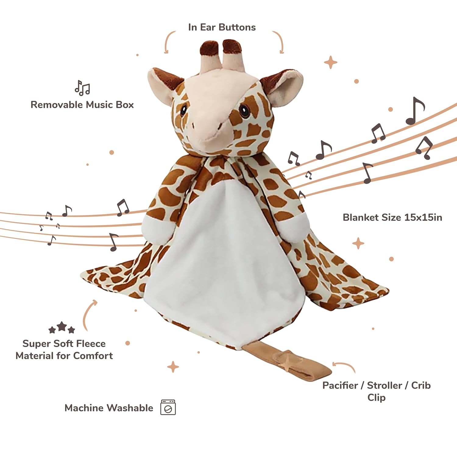 - Plush Comfort Meets Four-In-One Functionality: This baby music is a stuffed animal, sound machine, security blanket, and pacifier clip in one. Made from super soft fleece, it offers tactile comfort and auditory relaxation. A hidden loop lets you attach a pacifier or crib clip, making it a versatile crib soother or travel buddy to calm your baby at home or on the go.