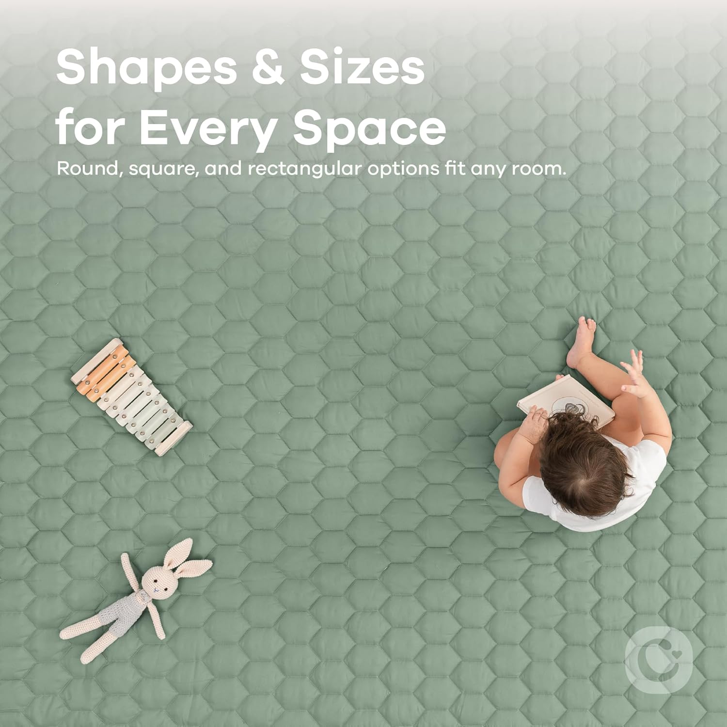 - Multiple Sizes and Shapes: Available in round, square, and rectangular shapes, and in different sizes, this padded play mat for baby fits easily into any nursery, living room, or play area.