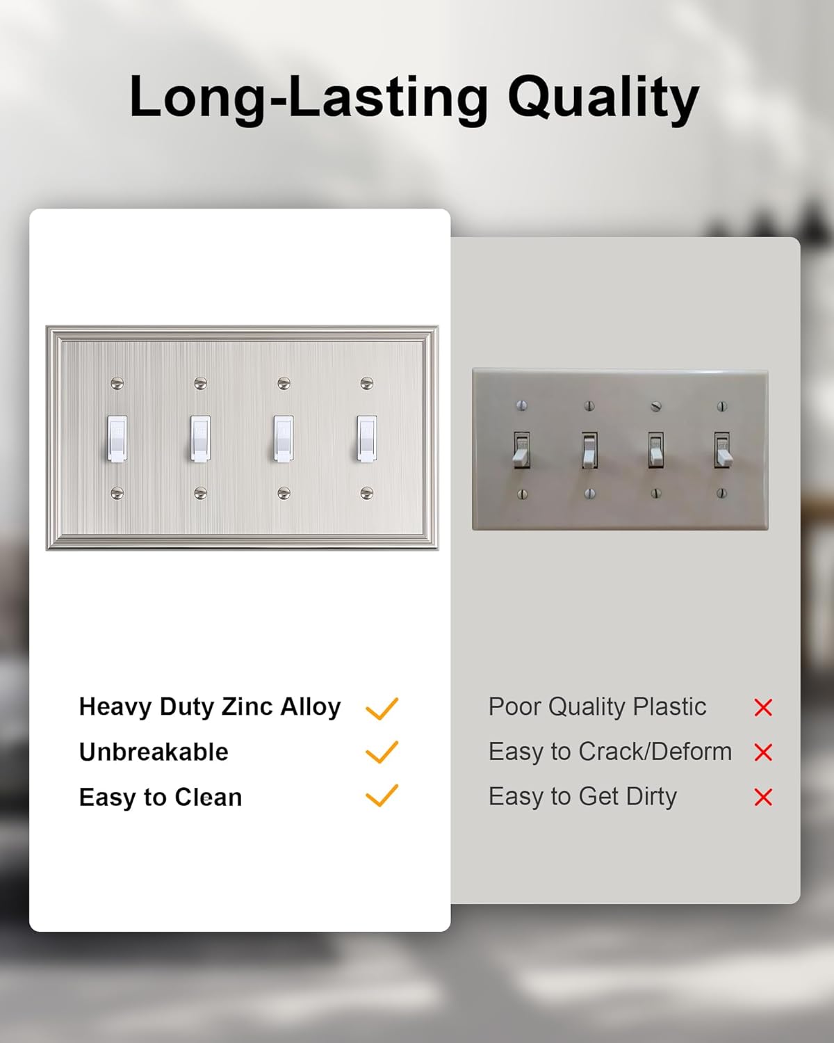 - Specification - Pack of 2 quad toggle metal wall plates, size at 8.58''W*4.92''H. Easy replacement of any wall plate with the same configuration, making it a convenient choice for remodeling or upgrading your home. Backed by a one-year warranty to ensure your peace of mind and complete satisfaction.
