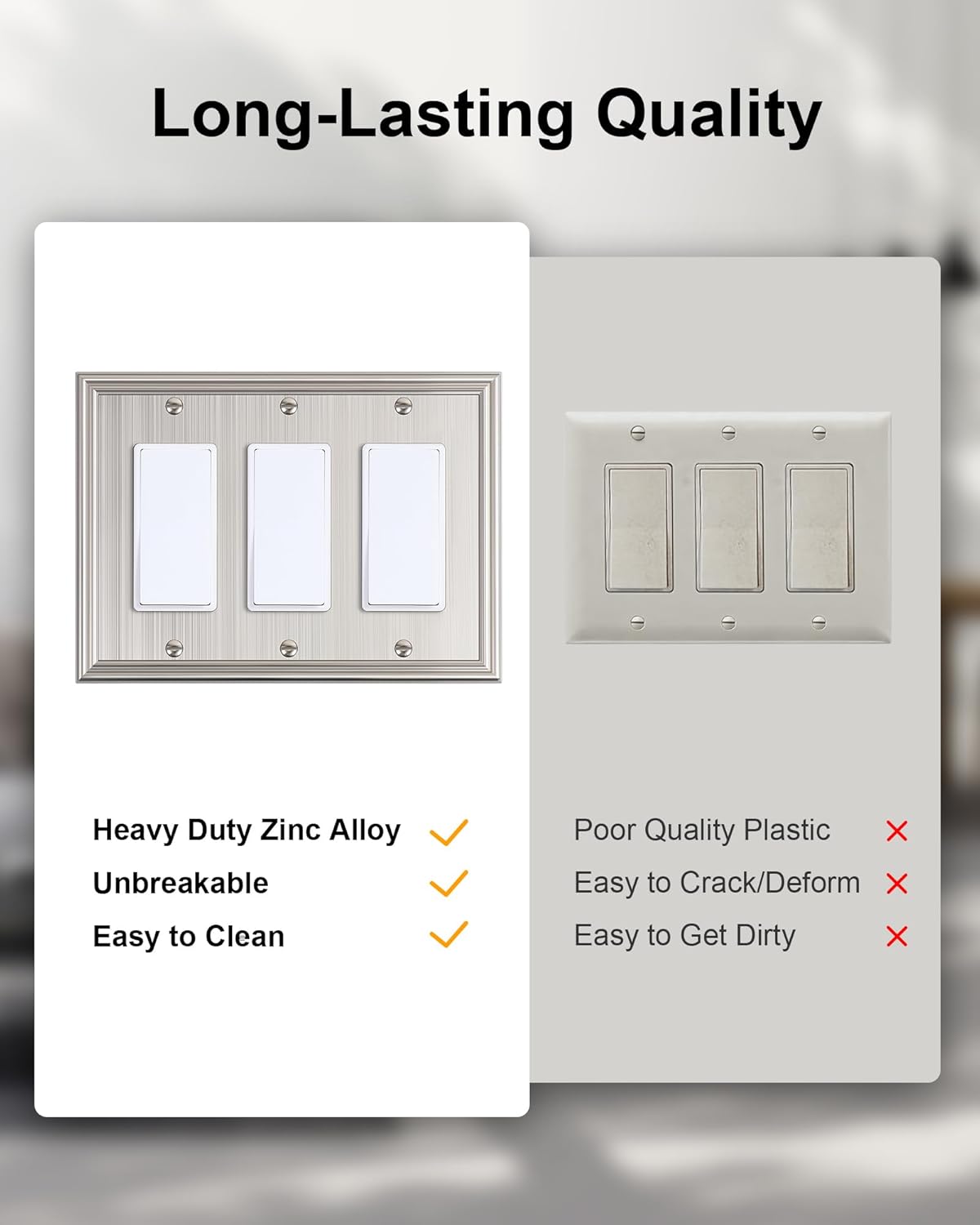 2-Pack Decorative Tripple Decorator Outlet Cover Plate, Durable Zinc Alloy Brushed Nickel Wall Plates for Electrical Outlets, Receptacle, GFCI Outlet, Dimmer Switch, 3-Gang