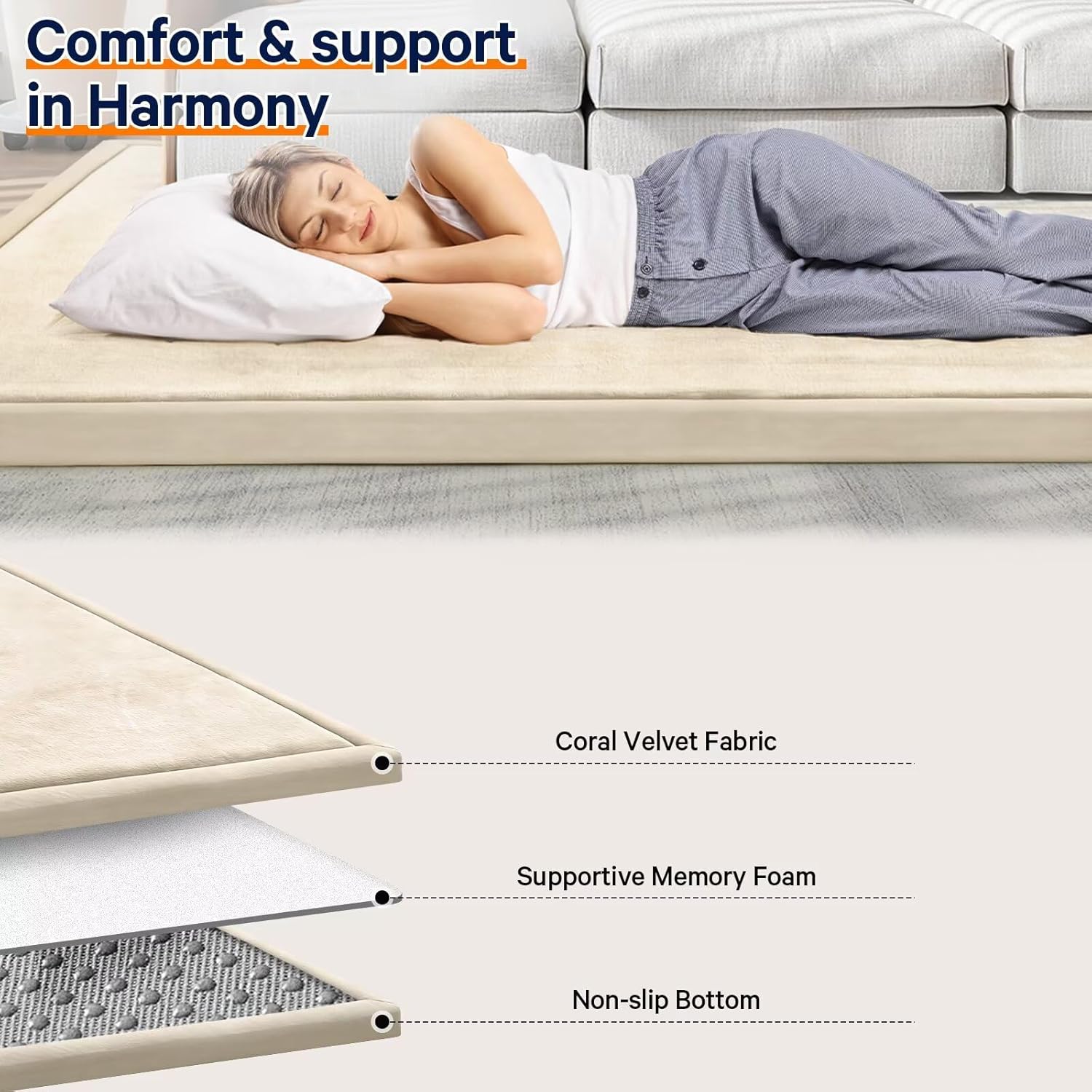- 🐣SAFE & COMFY: Our baby play mat is made of 100% coral velvet material and filled with high-quality 3cm thick memory foam,eco-friendly and durable, providing a safe and comfortable play area for your little ones, without worrying about them hurting themselves on hard floors.The surface of this floor mat is velvet cover, which is not only soft and comfortable to touch, but also has a good cushioning effect.
