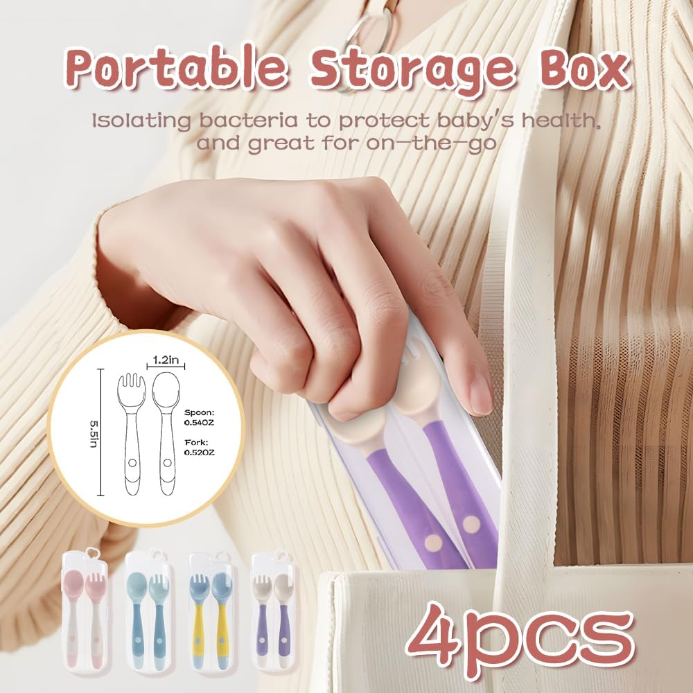 Baby Utensils Spoons and Forks Set Bendable Self-Feeding Silverware for Toddler Children with Travel Case Gum Friendly Food Grade (4 Set)
