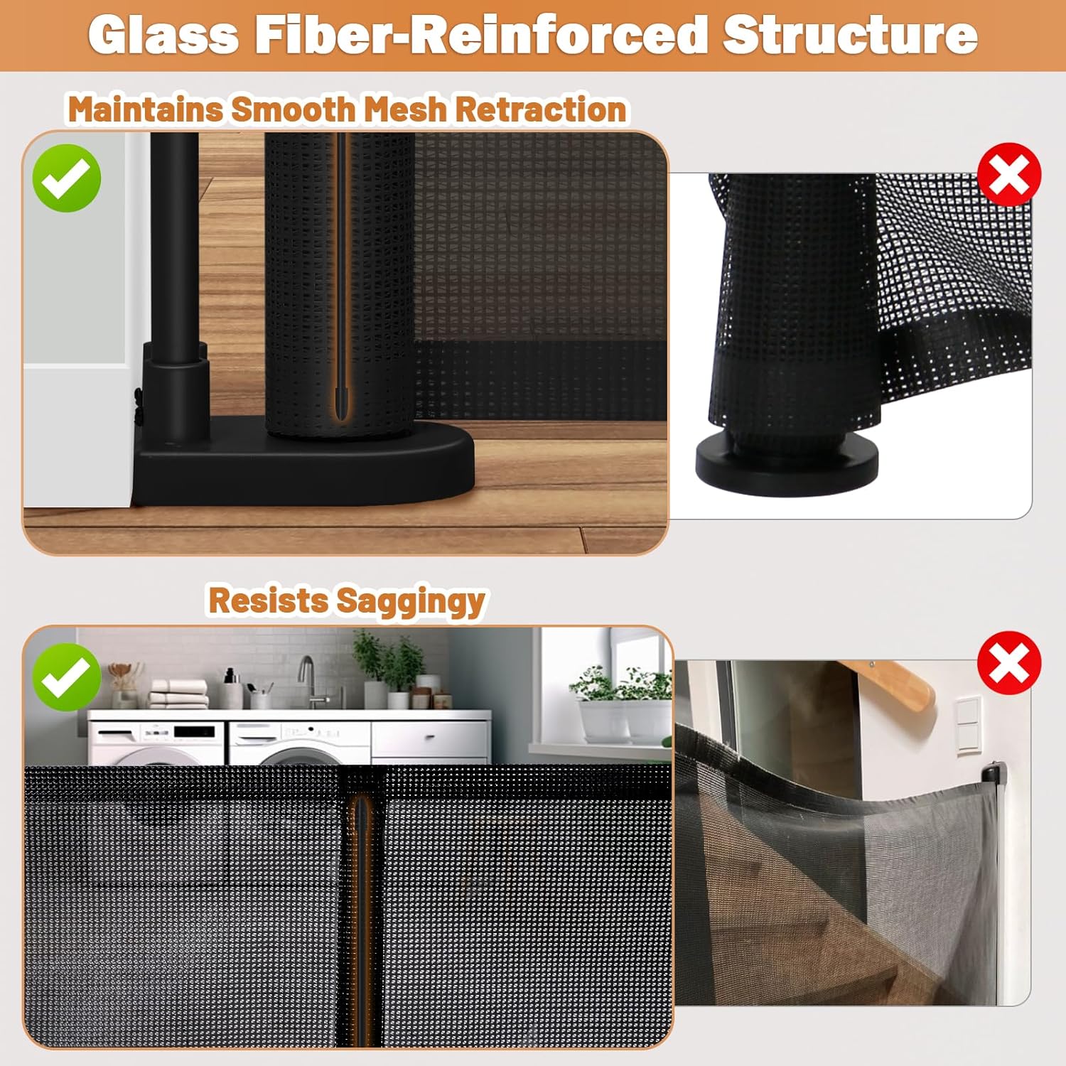 - 【Fiberglass Support】We have upgraded the retractable gate with fiberglass support strips, which prevent kids and pets from going under the mesh and reduce wrinkling. The mesh expands smoothly without getting stuck, making it effortless to use.