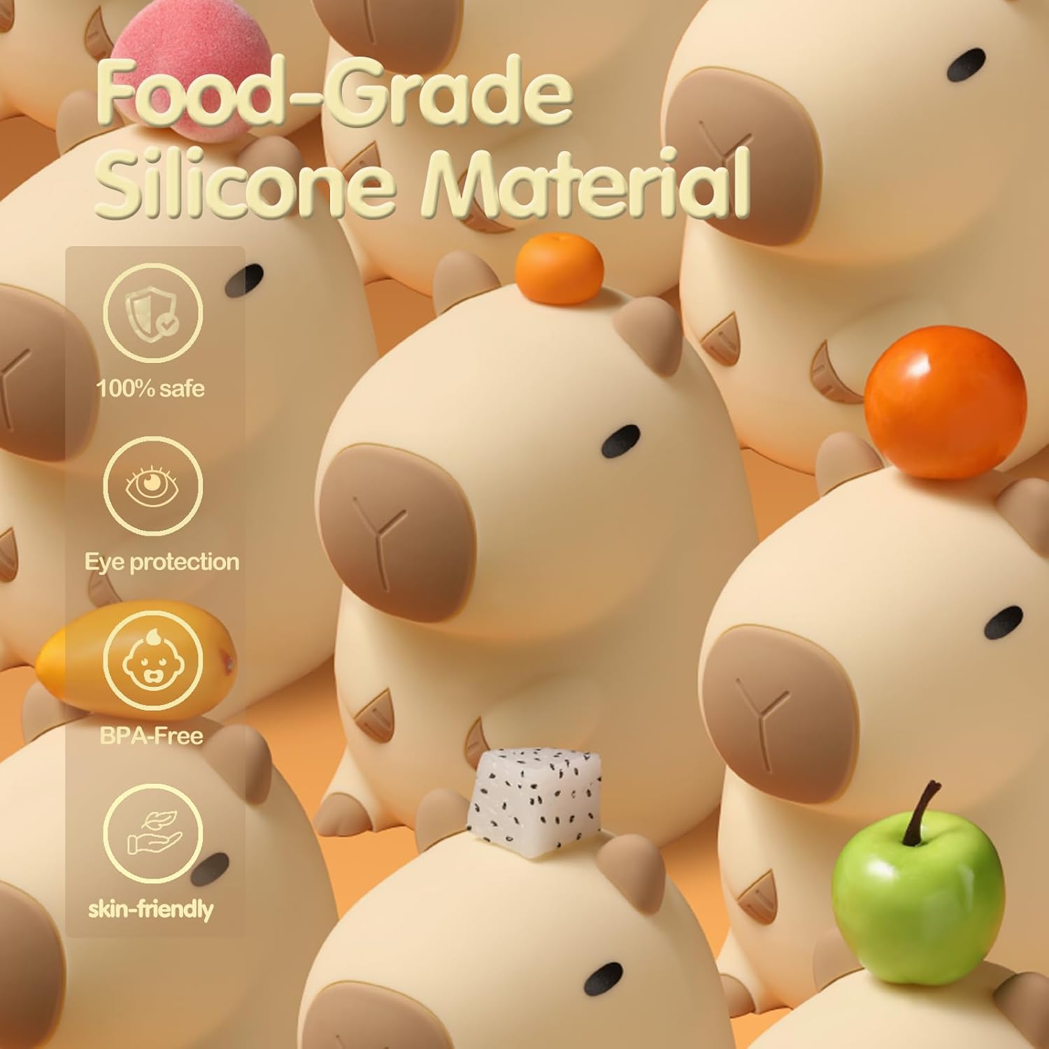 - [BPA-free] Capybara Night Light is made of safe and non-toxic food-grade silicone. As a touch-controlled baby night light that comes into contact with the body every day, we use the highest grade food-grade silicone that is BPA-free. Soft silicone can be kneaded freely and springs back quickly. The silicone exterior is thickened to prevent easy breakage or damage. It can be your stress reliever instantly. It is a baby night light and a stress relief toy.