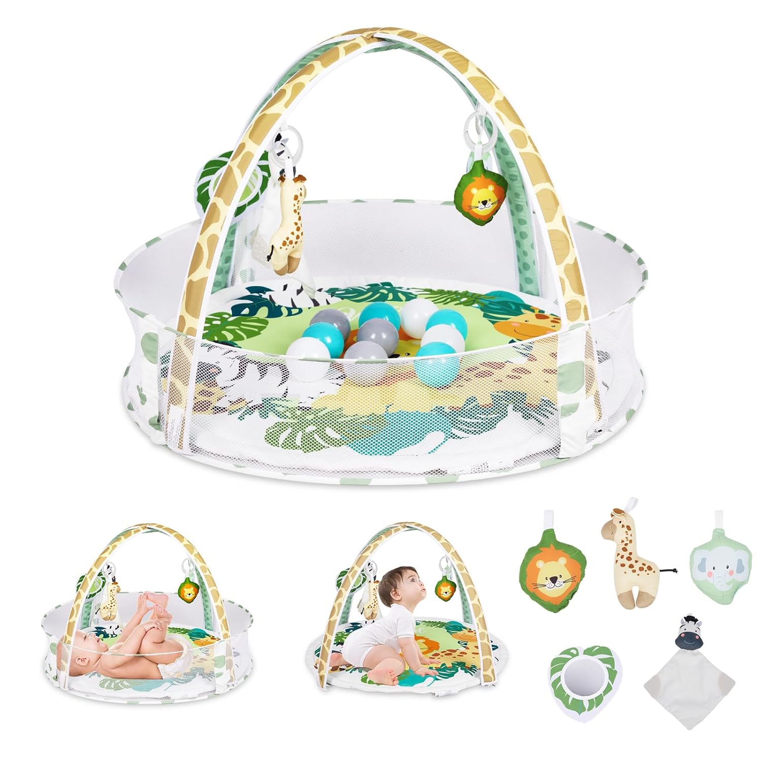 Baby Play Mat, 4-in-1 Baby Play Gym Tummy Time Mat with Ball Pit and 5 Detachable Toys for Newborn to Develop Sensory Exploration and Motor Skill 0-6-12 Months