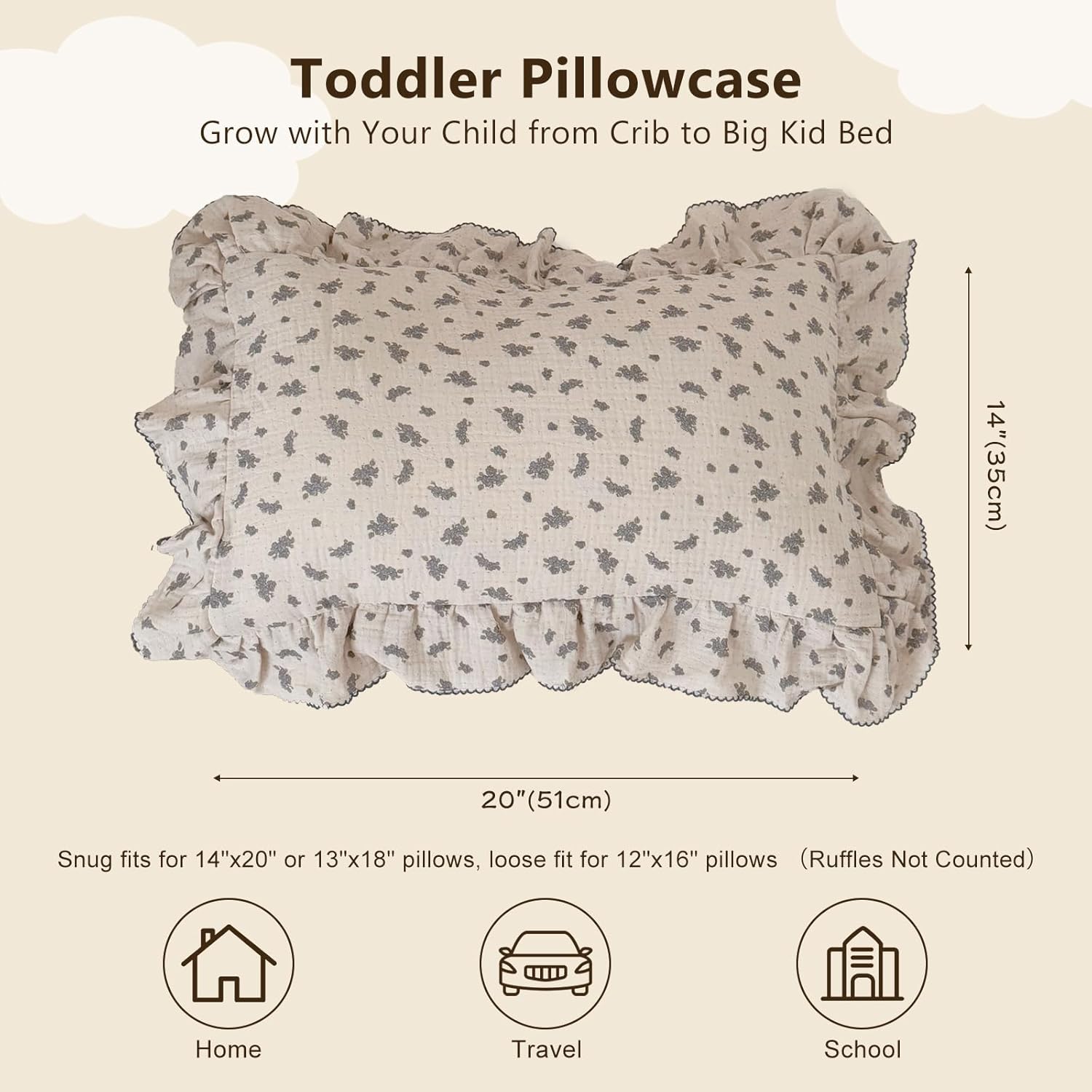 - 【Size】Toddler sized pillowcase measures 14x20 inch and snugly fits crib size pillows, recommended for 1-3 years old toddler girls boys on crib/cot/swaddle. Standard sized pillowcase measures 20x26 inch and snugly fits standard size pillow, recommended suits for 3-12 years old children on toddler/twin bed.The enveloped closure to keep the pillow securely in place.