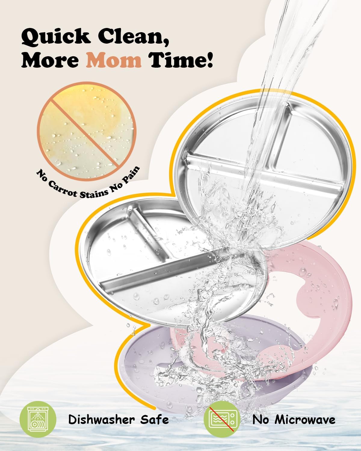 - No Plastic Taste. No Soap Smell. No Stains: The smooth, BPA-free, lead-free stainless steel surface of these kids plates, made from food-grade 304 stainless steel—safe, durable, and won't absorb odors or stain from carrots or berries—solving common issues with traditional baby silicone/plastic plates. Enjoy fresh, natural-tasting meals every time